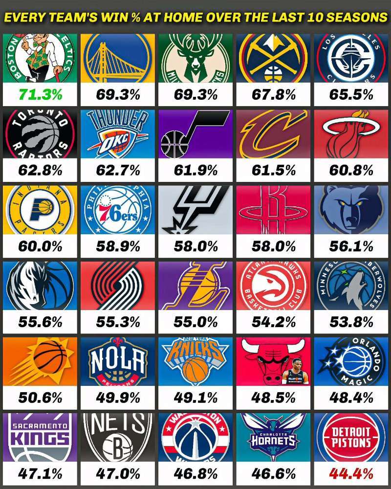 最近10年,联盟各个球队在主场的胜率排名,看看谁是名副其实的“魔鬼主场”?凯尔特