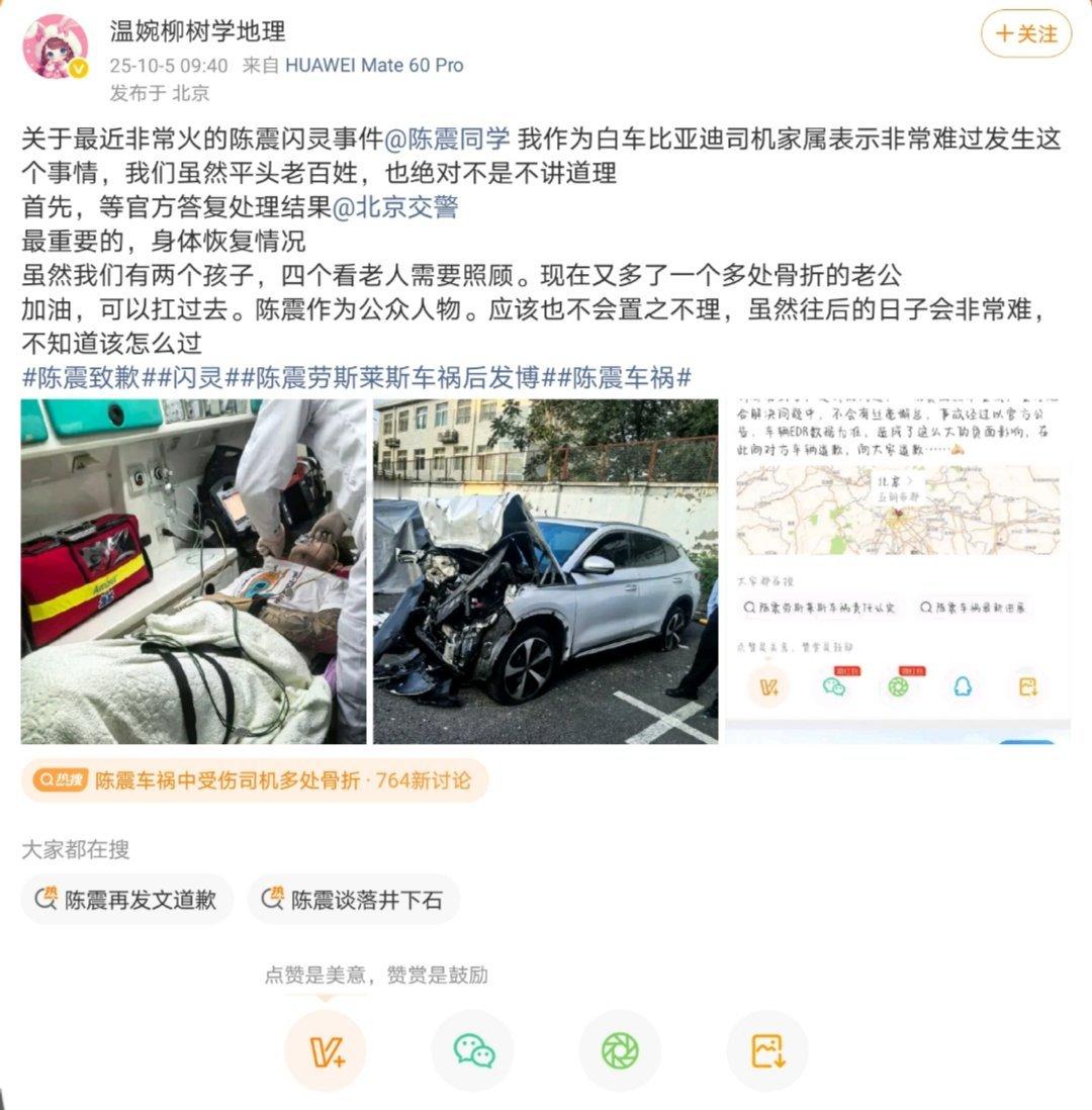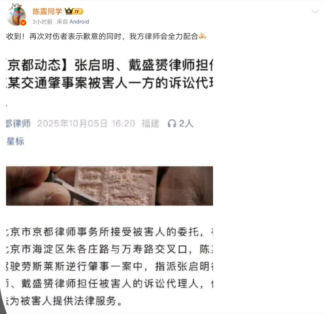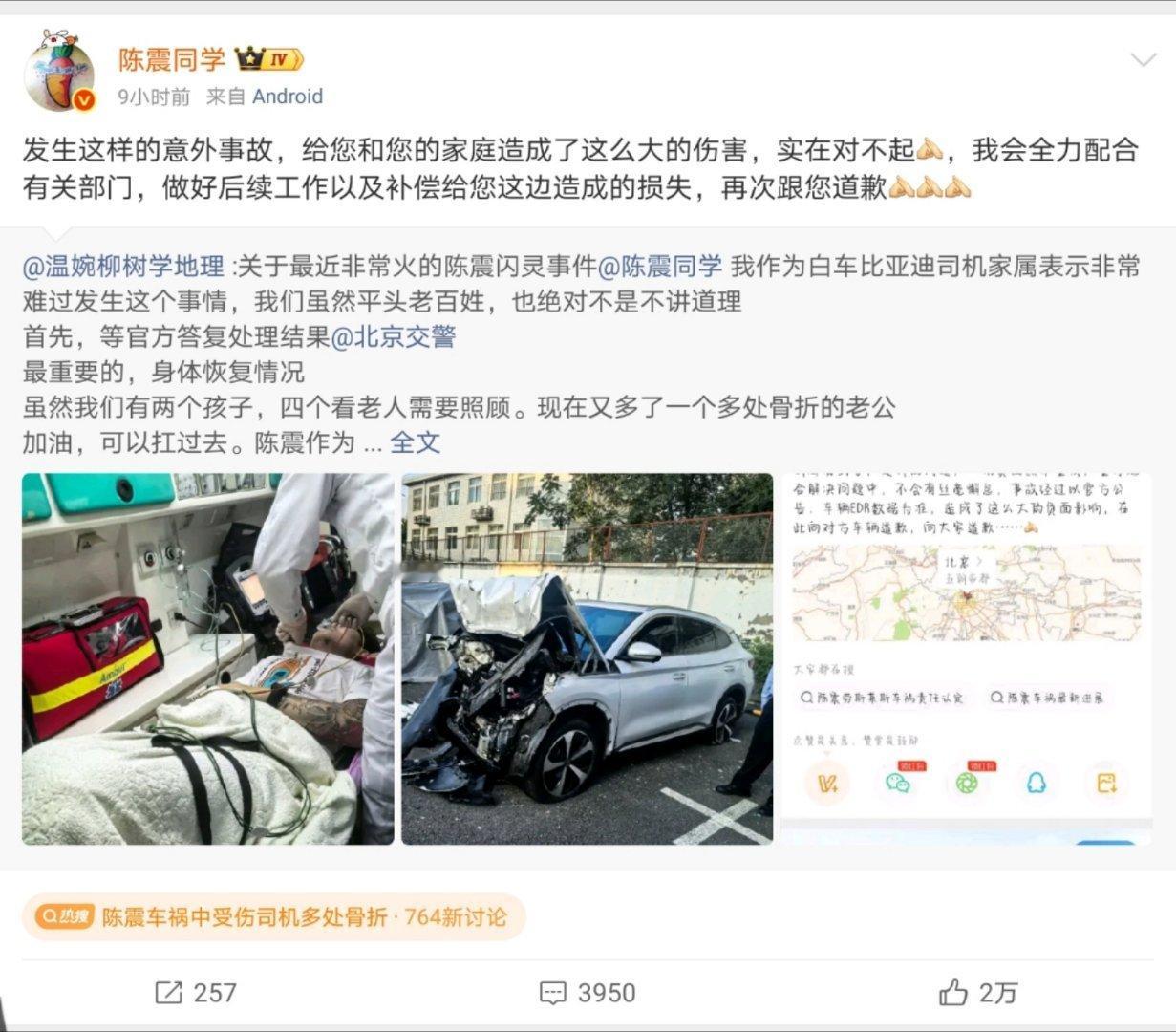 陈震车祸受伤司机家属发声其实这件事也没什么好说了,被害者已经找了律师,这次确实是陈震全责,就看受害者跟律师以及陈震方律师的沟通呗,所以当事人有没有联系受害者这块其实也不是很重要,不过陈震也是很快在回复当中嗅到舆论危机,毕竟是个公众人物,如果放点消息,可能大家觉得陈震公众人物太高高在上了,但双方都找好了律师,那肯定直接让律师去沟通啊