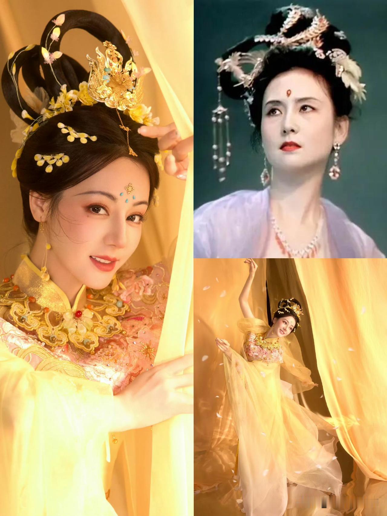真是越来越搞不懂迪丽热巴了, 明明一副异域风情的浓颜系长相, 高鼻梁,大眼睛,双眼皮,浓密的卷发, 但扮演起中国神话传说中的古典美女嫦娥来, 一点也不难看! 迪丽热巴一身黄色仿若柔云的纱衣,搭配复古发髻,简直就是从月宫走出的嫦娥仙子。 尤其是古韵十足的眉毛,和眉间的一点花钿,让她少了异域感,也多了几分仙气。 果真,浓妆淡抹总相宜。 真正的美女,什么造型都能驾驭。 我敢说,迪丽热巴这款嫦娥造型,已然超越老版西游记了! 大家觉得热巴美,还是老版嫦娥美?