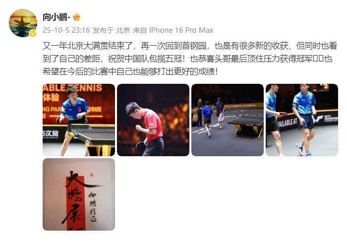 直播吧10月6日讯WTT北京大满贯全部比赛结束,向鹏在男单1/4决赛中以4-3逆转世界排名第三的雨果杀入半决赛,虽然半决赛惜败给队友王楚钦,但本站赛事他表现还是相当出色。本站赛事结束后,向鹏社媒分享比赛照片,祝贺中国队包揽五冠,恭喜王楚钦男单夺冠,并自勉希望在以后的比赛中取得更好的成绩。