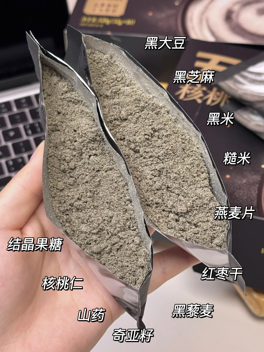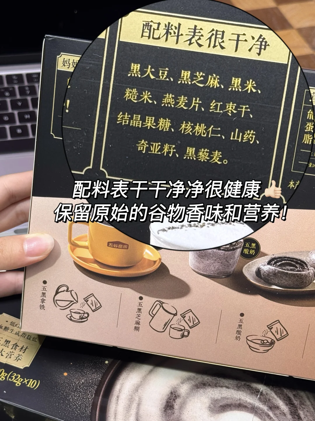 黑大豆、黑芝麻、黑米、核桃仁、黑藜麦……配料表干干净净!全是对我们脆皮打工人巨友好的食材~