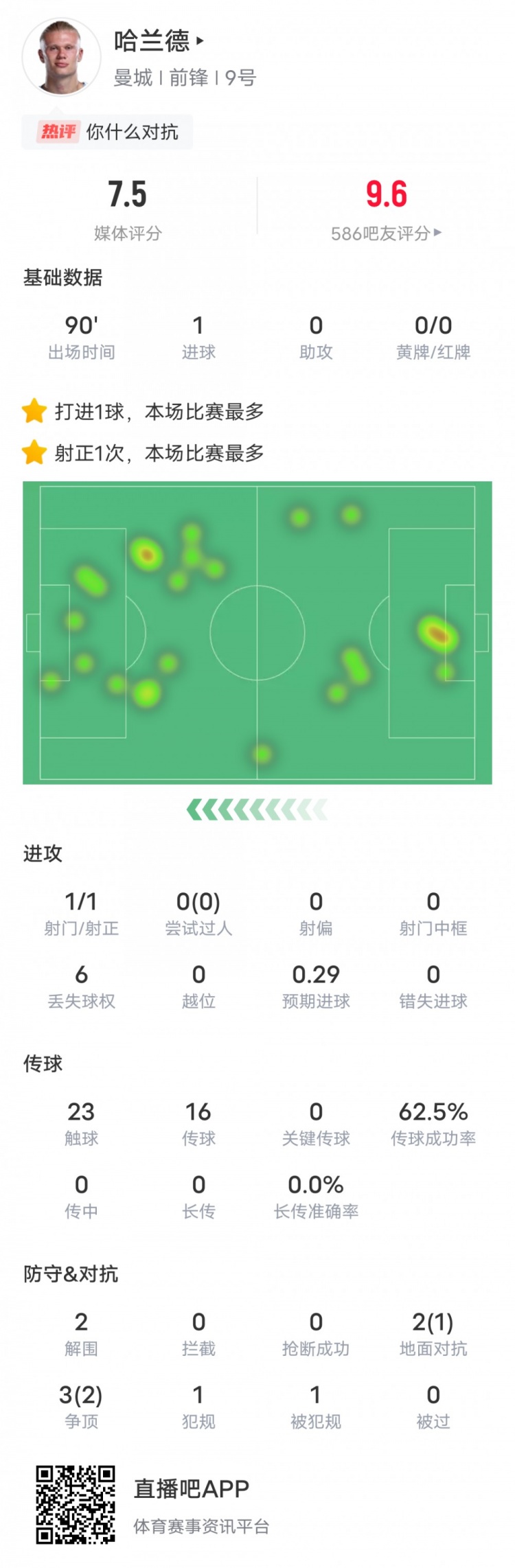 7场9球领跑英超射手榜!官方:哈兰德当选曼城1-0布伦特福德MVP
