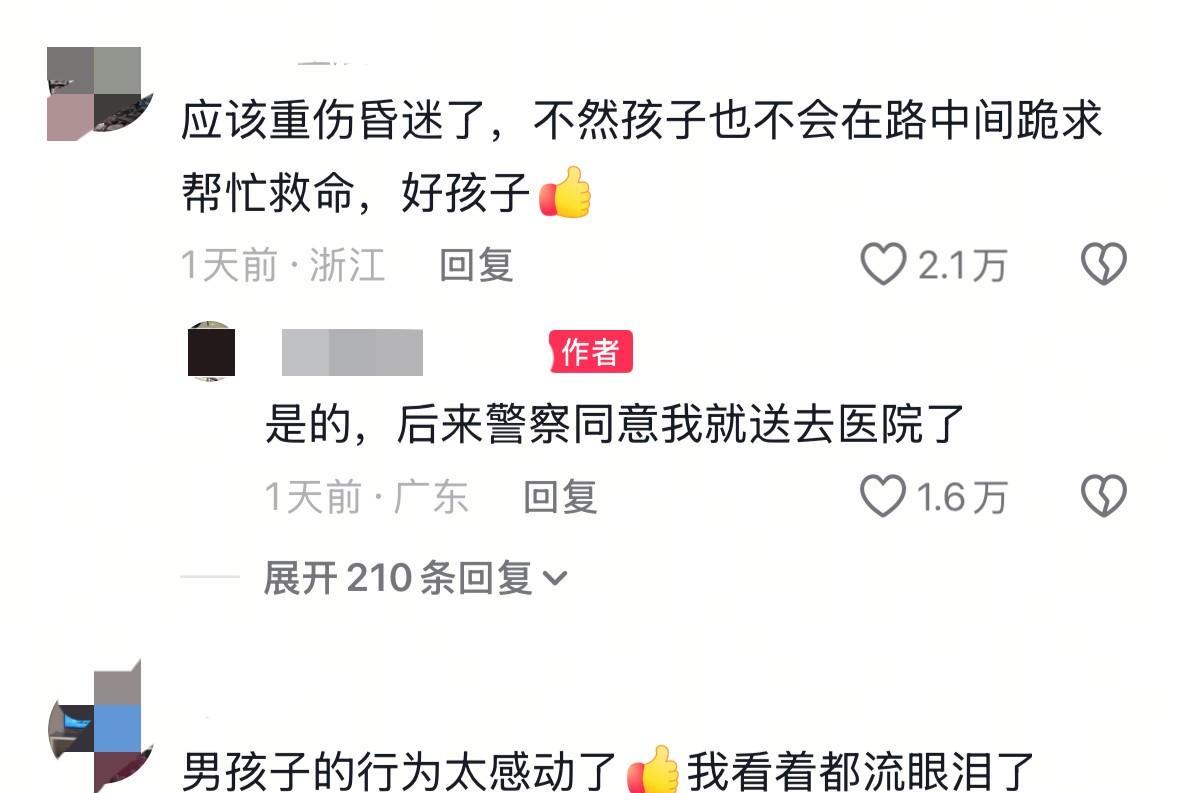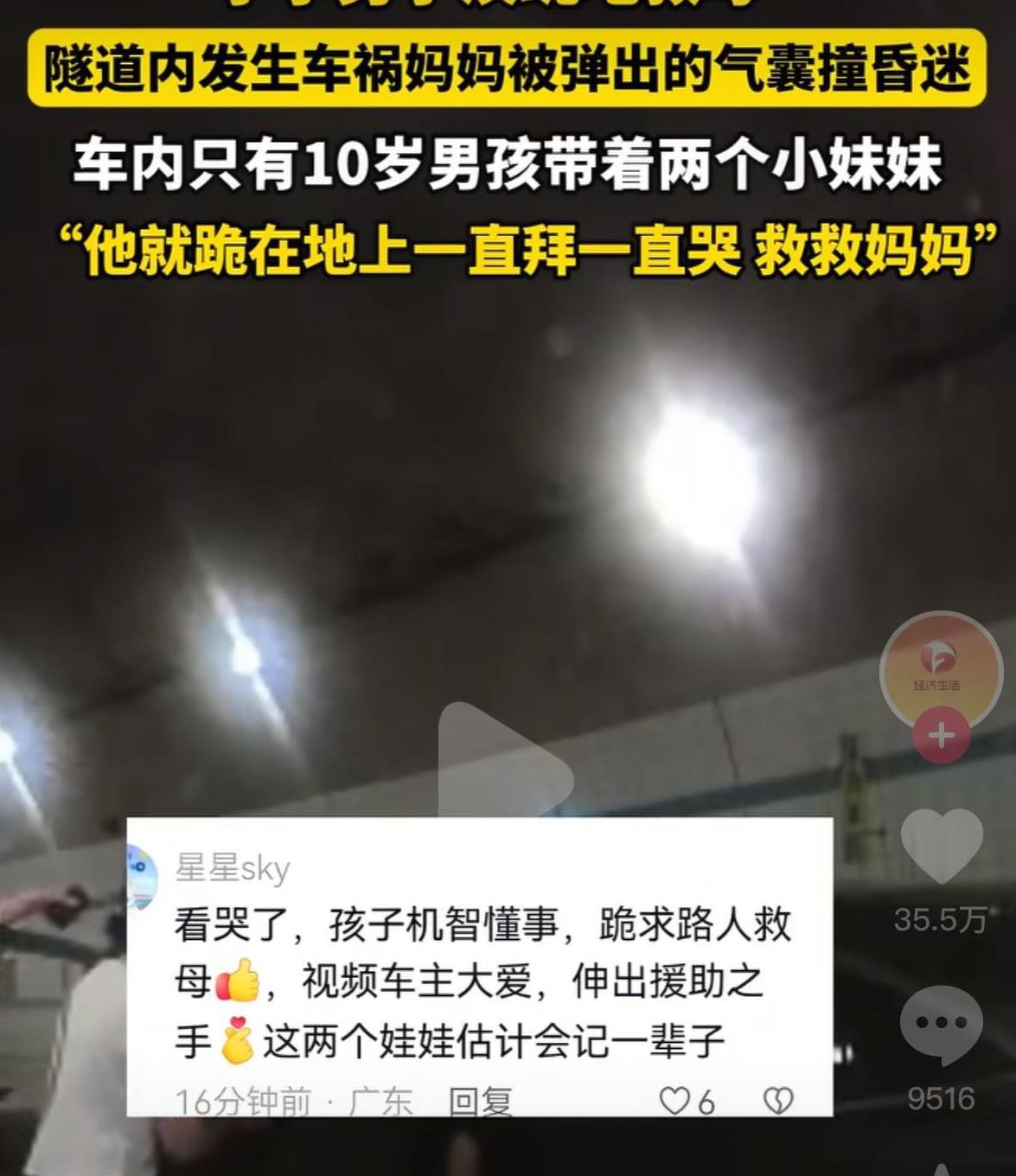 广州10岁跪地救母的小男孩,当时还带着2个年幼的小妹妹!眼见母亲昏迷不醒,他稳住妹妹们坐在相对安全的车里,自己则拉开车门跪在了地上! 事情发生在广州天河区的一个隧道里,当时有三车连撞,小男孩所在的车子就是第三台。由于追尾时冲击力较大,她的母亲被弹出来的安全气囊撞晕了。所幸,后排坐的三个孩子安然无恙。 车祸发生后,车上10岁小男孩在没有大人的指引下,做出了一个感人肺腑的举动: 他稳住两个妹妹坐在车上不动,自己拉开左侧的车门,跪在了地上,双手合十不停祈求过路车主对母亲施以援手。大家被他的孝心感动,很快就有人上前帮忙了。 他才10岁啊!还是一个很小的孩子,遇到车祸,他也很害怕很无助。可他不仅没有乱跑,还全程冷静处理好了问题。当好心人将他搀扶起来那一刻,他才敢放声大哭! 坦白说,看到这个细节时,泪水一下就模糊了我的双眼。 这个小男孩年纪虽小,但却是顶天立地的男子汉。那一刻,他没有考虑自己的安危,一直心系母亲。他在关键时刻的一跪,让大家更快的发现了他母亲的处境,从而帮她争取到了更快的救援时间。 有子如此,是她母亲此生最大的幸福![祈祷][祈祷][祈祷]