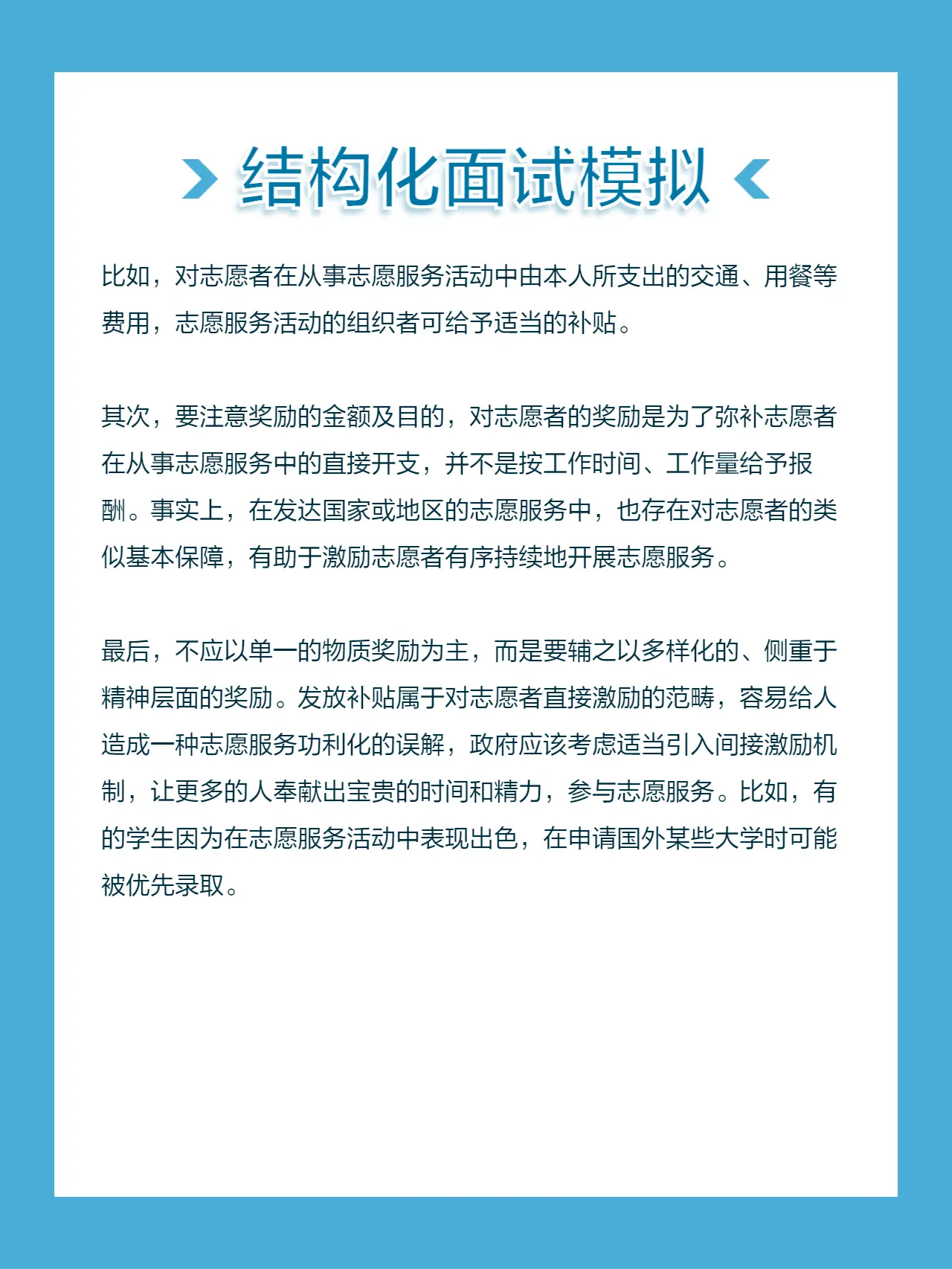 面试 结构化面试 考公面试 面试模拟为了鼓励市民积极参与志愿者活动,某市出台一项政策,为优秀志愿者提供报酬和慰问品,有人认为这有违志愿者服务的理念。你怎么看?