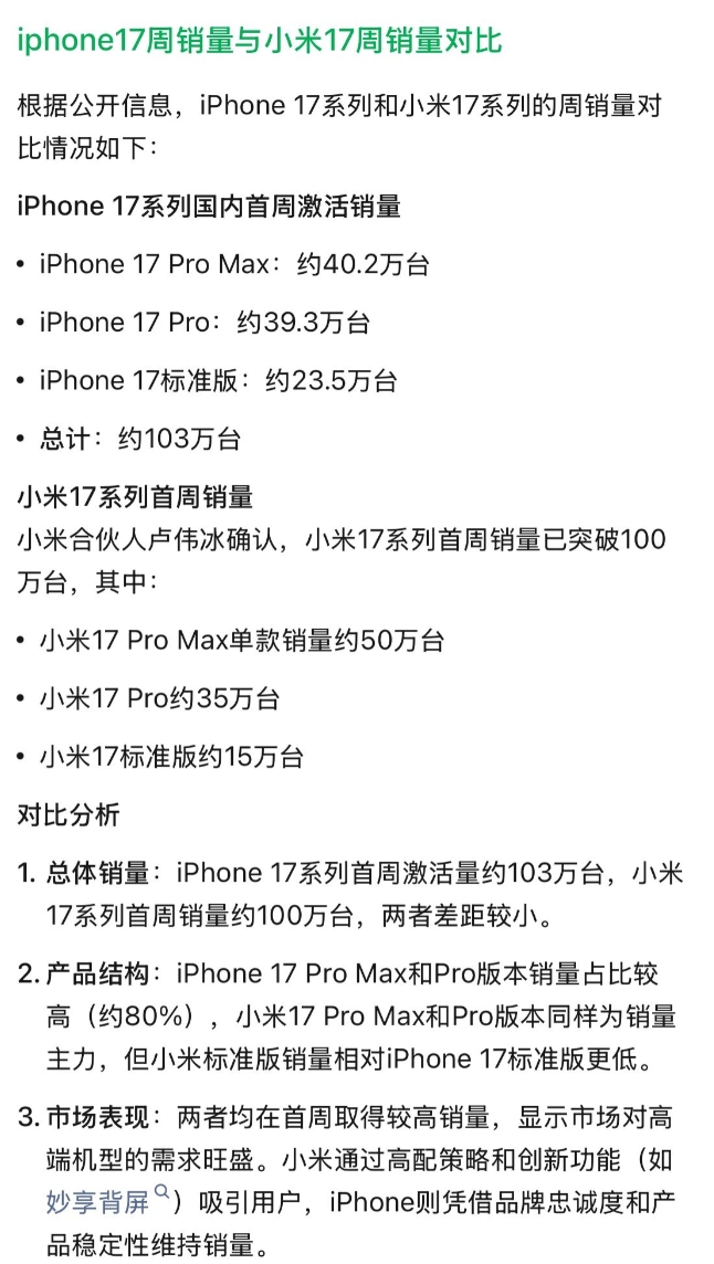小米高管发微博说小米17卖超过百万台,许多网友质疑没这么多。 有人说自己身边根本没看到有人用小米17,这个数据水分太大。 有人是因为小米广宣海报,要看小字的影响,对小米的信任度降低。 这些数据到底真不真实,普通百姓真不好判断。 100万人相较14亿,的确能碰到机率不大。 营销经常性夸大宣传,数据掺水分也不是没可能。 当然,这不影响你想用或者不用小米手机。 喜欢的依然会买,不喜欢的当然会看都不想看,包括它的宣传。