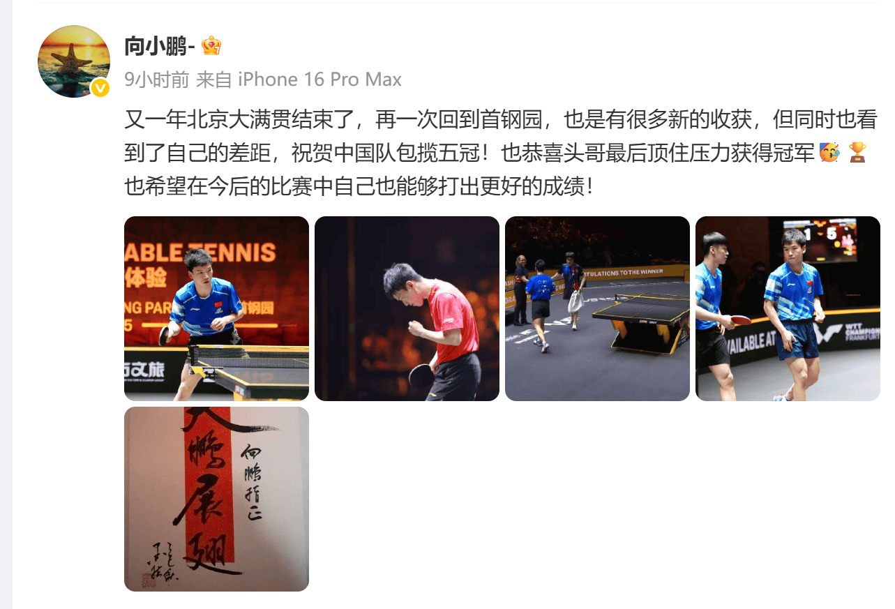 向鹏在社交媒体上这样写道:“又一年北京大满贯结束了,再一次回到首钢园,也是有很多新的收获,但同时也看到了自己的差距,祝贺中国队包揽五冠!也恭喜头哥最后顶住压力获得冠军也希望在今后的比赛中自己也能够打出更好的成绩!”