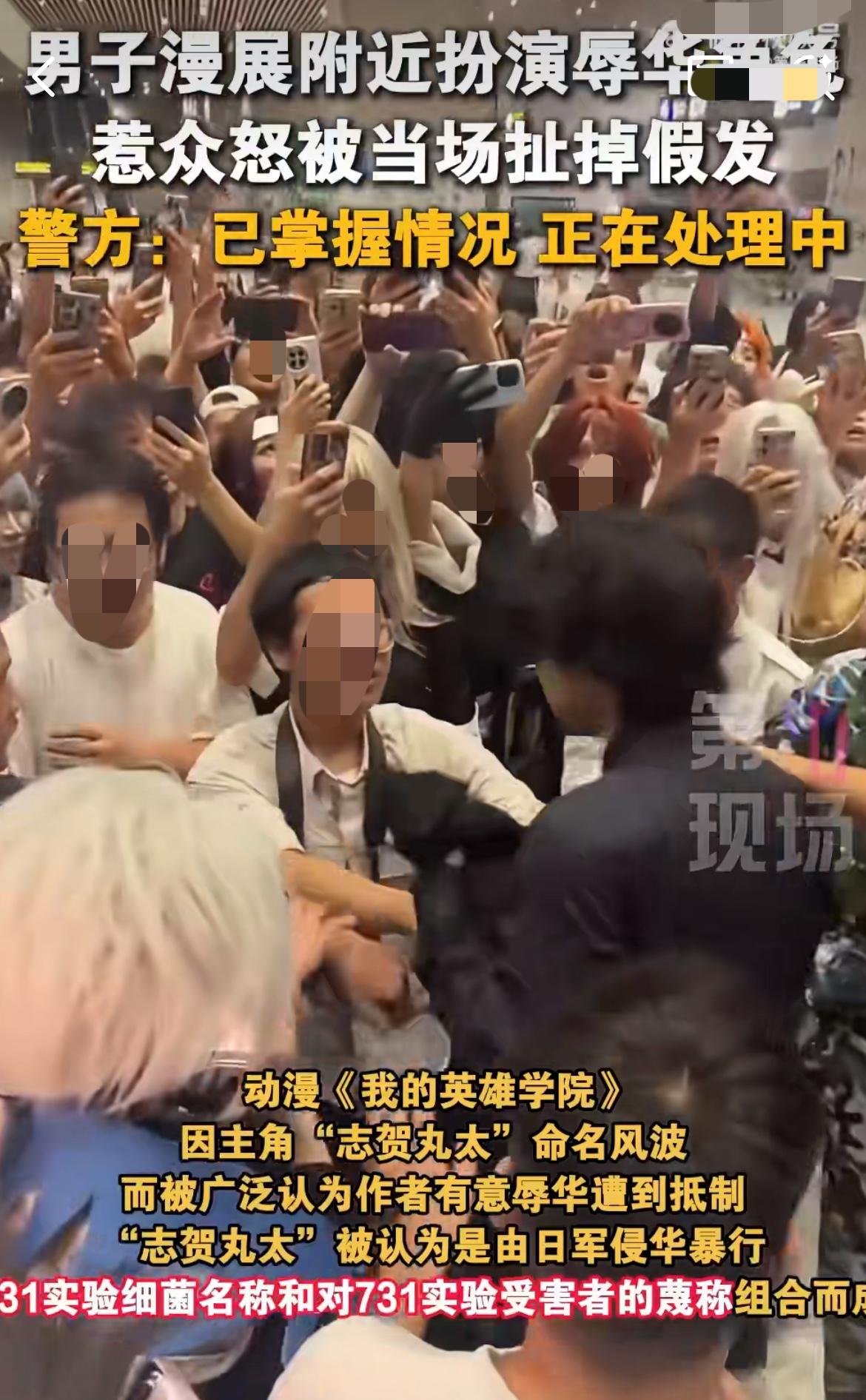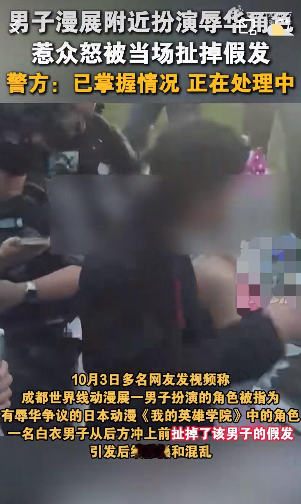 2025年10月3日,成都世界线动漫展现场,一名头戴红白假发的男子,被指扮演争议日漫《我的英雄学院》中的角色。 要知道,《我的英雄学院》因“志贺丸太”命名风波,被认为存在辱华意图,遭广泛抵制,甚至被圈内称为“鬼子学院”——“志贺丸太”被认为是由日军侵华暴行中731实验细菌名称和对731实验受害者的蔑称组合而成。 现场,众人质疑男子扮演辱华角色,有人气愤地抢走他头上的假发,众人蜂拥而上并呐喊:“鬼子死绝。”过程中多人围攻并推搡男子,致其倒地,好在有人及时制止:“别打,打了要进派出所。”后续,男子被身穿蓝色制服的人员带走。漫展辱华 柜子学院辱华 成都动漫节 民族尊严是不可逾越的红线,任何试图触碰、伤害民族情感的行为,都必将受到强烈谴责与应有的处置,绝无半分容身可能!
