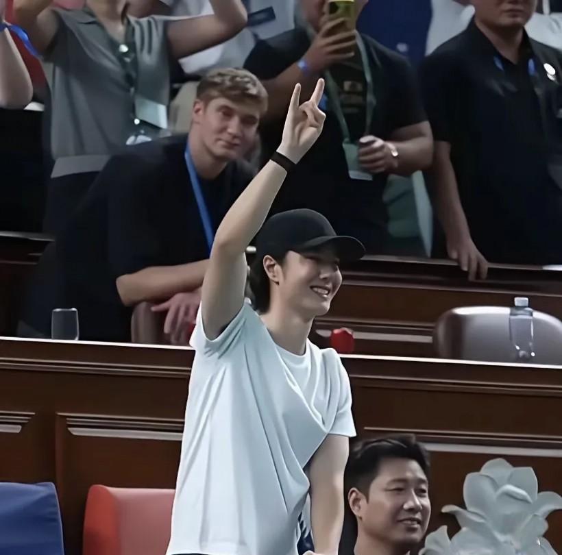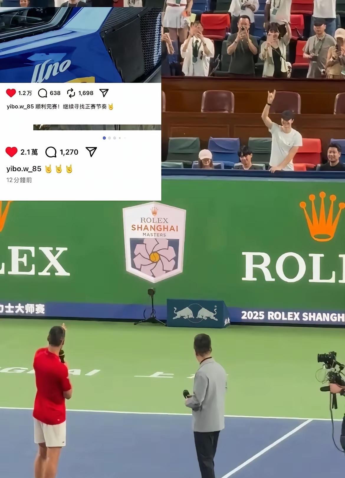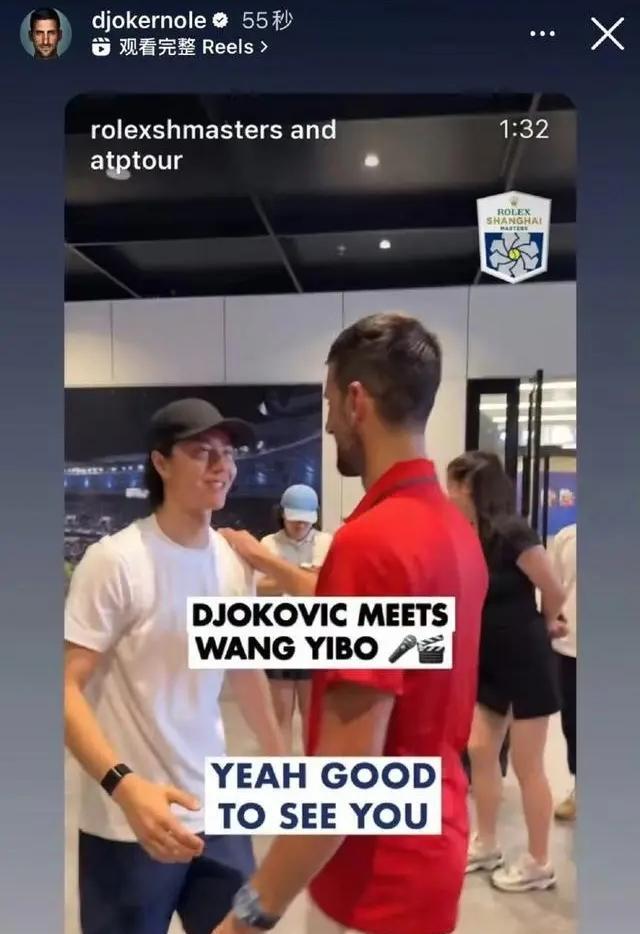ATP1000上海大师赛男单第三轮,四届赛会冠军德约科维奇苦战2小时42分钟,以4-6、7-5、6-3逆转击败资格赛球员汉夫曼,晋级16强,获胜后,他突然用中文向观众席高喊“一博!谢谢!”,直播镜头精准捕捉到他清晰的口型,坐在头排身着与德约一样“GOAT”系列联名白衫的王一博立刻起身挥手,因品牌长城活动结缘的两人,又来了一次梦幻联动。与上一轮一样,他赛后不仅用中文感谢现场观众,又尝试在镜头上写中文的“德”字,这回写得非常准确!