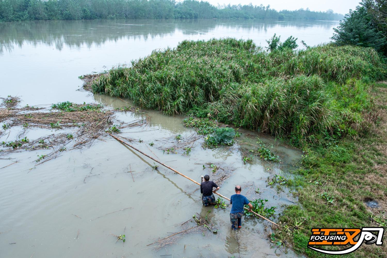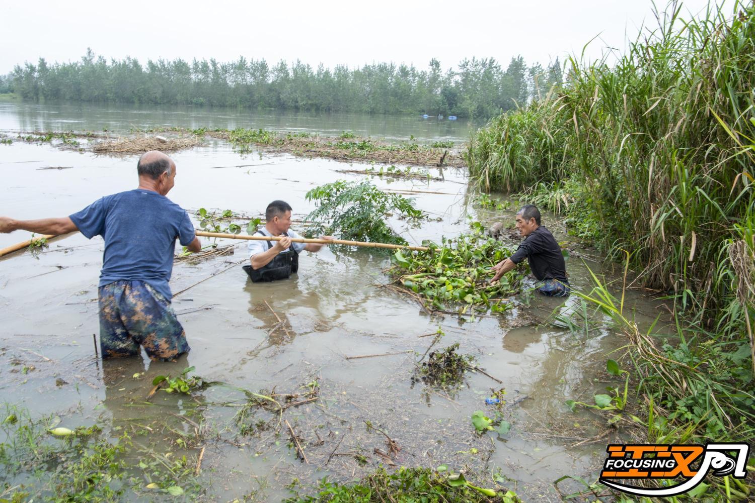 10月4日,在东荆河洪湖万全中岭闸,洪湖东荆河管理分局的防汛值班人员和村民一道,清理篙排水葫芦等漂流物,保证河道过峰畅通。