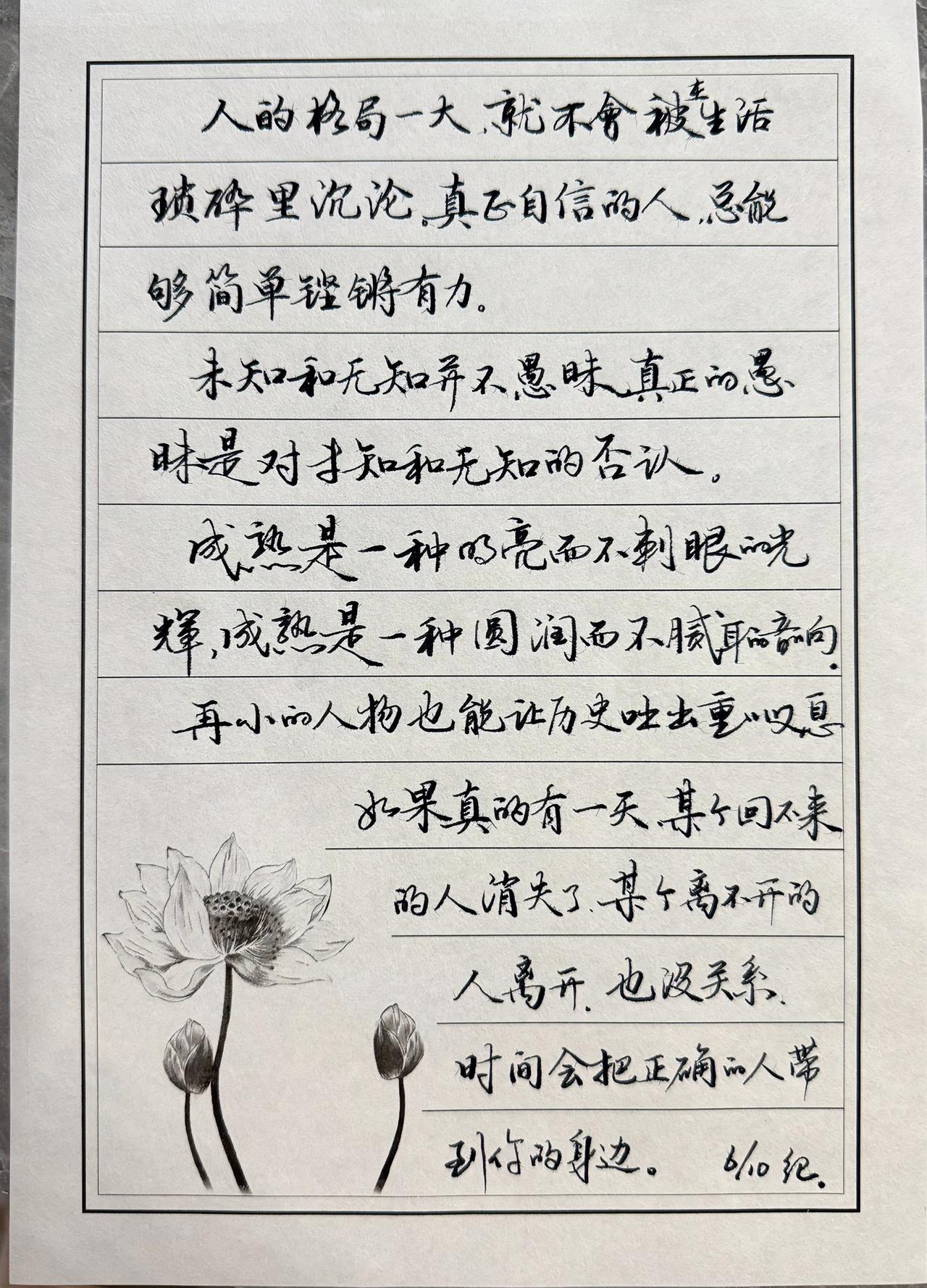 有和我一样的吗? 中秋节也写几笔的吗? 你们出去玩了吗? 我哪也没去, 过完节我们就又可哪跑了。 有个人留言很客气的问好 我很客气的回好 紧接着 他很友好发个友好的图片 我友好地回复一个友好的图片 紧接着 他说能交个朋友吗? 我回复说可以 紧接着 他问我多大了 我回复说快七十了 接下来 再也没有紧接着了[呲牙] 是不是我的字 真的有年轻气质女的味道呢?