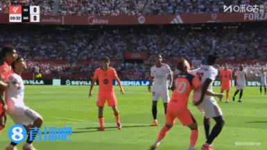 塞维利亚第二个进球前巴萨声称孔德被犯规的拼抢↓
