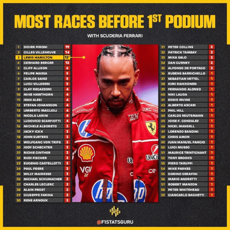 汉密尔顿已连续18站大奖赛比赛未能为法拉利登上领奖台,创下车队纪录。(与法国车手迪迪埃-皮罗尼并列,后者在1981-1982年代表法拉利连续18站未登台,直至1982年圣马力诺站夺冠)