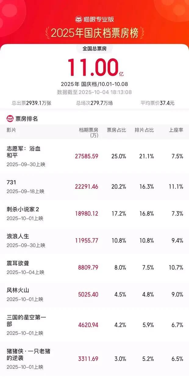 家人们,国庆档银幕大战胜负已分!截至10月4日,票房以雷霆之势冲破11亿大关,影