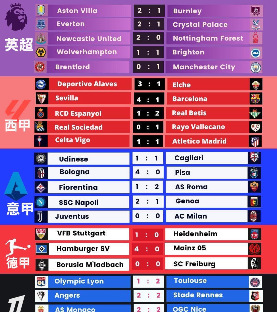 周日欧洲五大联赛结果: 英超: 法甲: 德甲: 意甲: