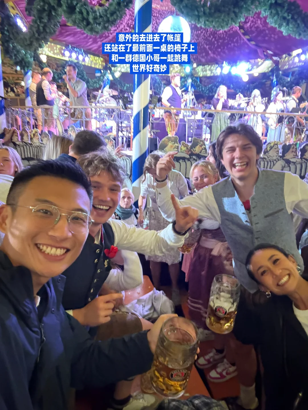 🍺慕尼黑啤酒节: 啤酒节会一直从白天营业到凌晨,体验超乎我的想象。晚上来更有氛围,开始我以为就像圣诞集市,但是疯狂程度真的远超。集市上有很多可以玩的娱乐项目,都很好玩。路边的小吃摊随便买我觉得都很好吃。路上随处可见穿着好看的传统服饰的喝嗨了或者喝大了的人,但是每个人的快乐因子都弥漫在空气里。每个帐篷风格里面的风格各不相同,但是要提前预定才能进去。我们没有预定但却阴差阳错的就进了 Paulaner 的帐篷,走到离舞台很近的地方想去看歌手表演,还被一群很帅的德国小哥邀请一起站在上了他们桌的椅子上一起跳舞