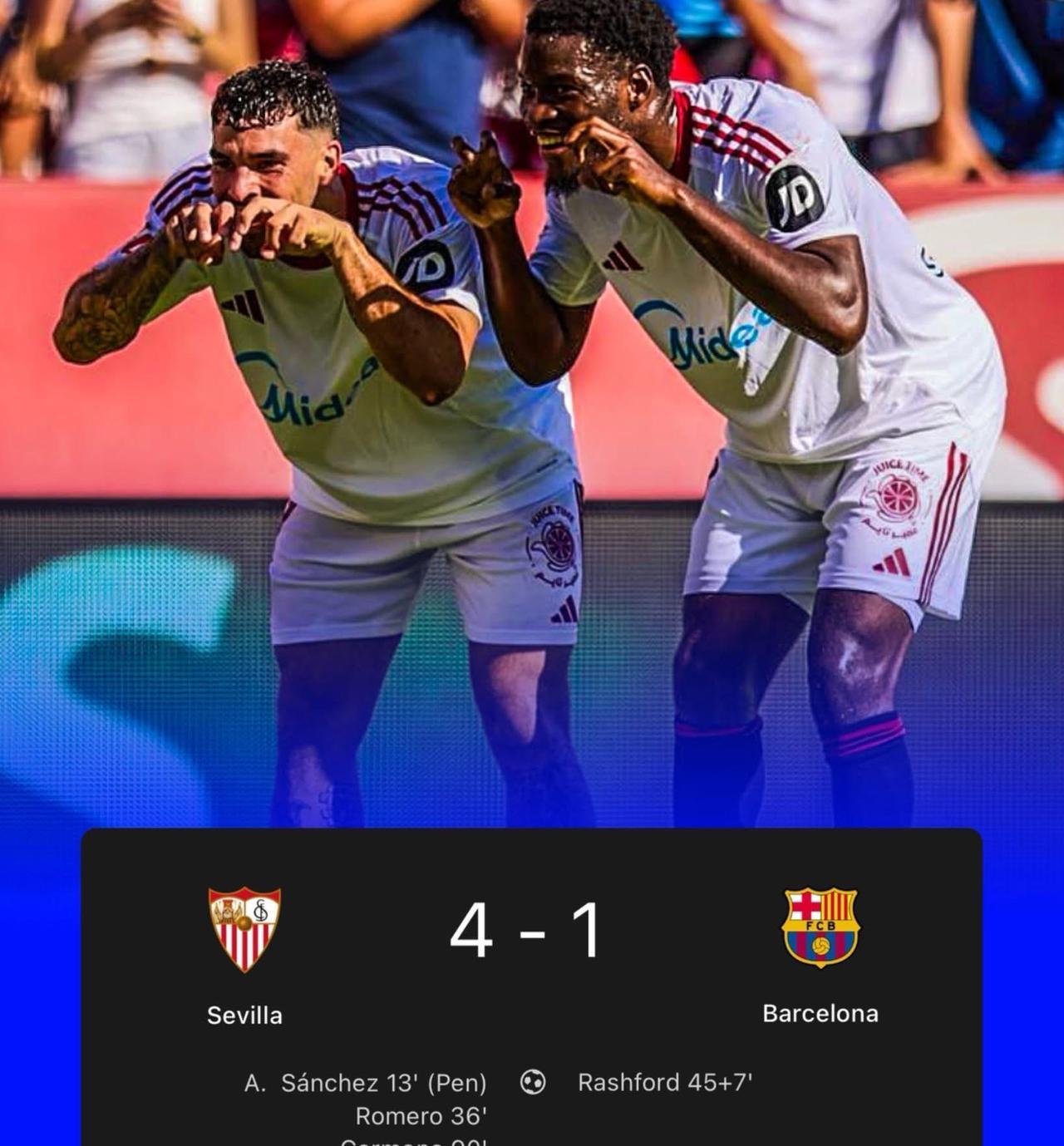 西甲赛事: 第八轮:塞维利亚对阵巴塞罗那 巴萨1比4惨败塞维利亚,遭遇本赛季西甲首败,同时也把榜首位置拱手让给了皇马! 这个剧本,与曼联1比3输给布伦特福德那场非常相似。 巴萨一度有机会通过点球扳平比分,可惜莱万久违地罚丢点球,然后巴萨就溃不成军了,最终以1比4惨败。 曼联对阵布伦特福德的时候,B费同样有机会通过点球扳平比分,但是同样没能把握住,最终1比3输球。 拉什福德破门难救主,虽然是输球,但拉什福德的表现,真的越来越好啊!