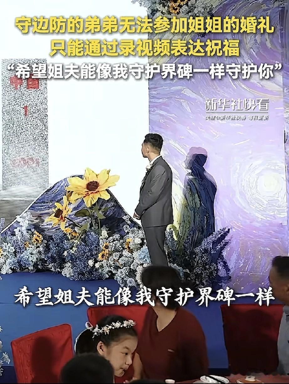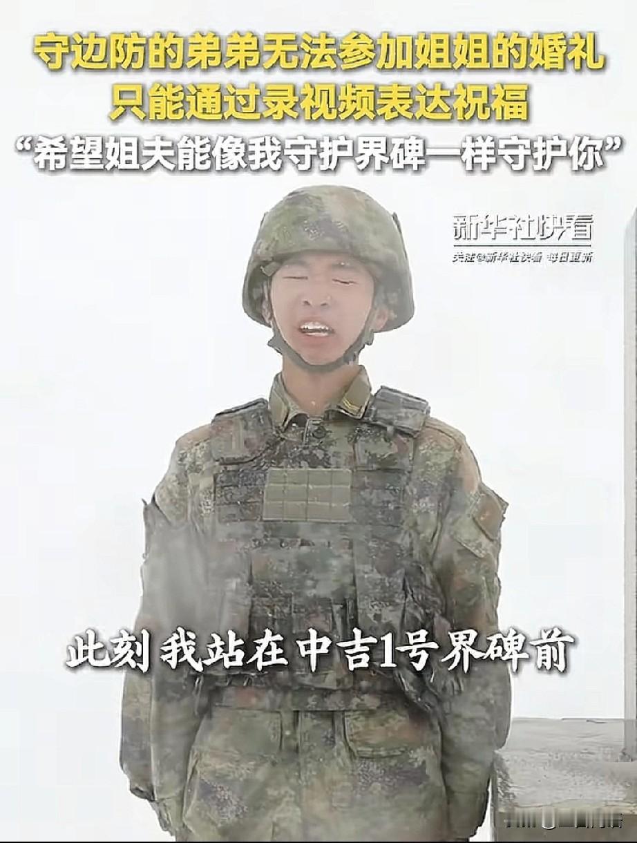 “瞬间泪崩!”在浙江湖州一场温馨的婚礼上,新娘正身着洁白婚纱,与到场的亲朋好友一一致谢,忽然现场大屏幕亮起,竟是一段来自远方的视频。画面中大雪纷飞,弟弟裹紧厚重的冬装,站在“中吉1号界碑”旁,面庞被寒风吹得通红。他开口第一句话便是:“姐姐,请原谅我没法亲自陪你出嫁。” 只这一句,新娘的眼泪便止不住地往下落。 视频里,弟弟身姿挺拔地立于积雪之中,背后是绵延的雪山,面前是庄严的界碑。他郑重地说道:“此时此刻,我在这里站岗,遥祝你新婚快乐。愿姐夫能像我守护这座界碑一样,永远守护你。” 谁都明白,姐姐出嫁,弟弟往往是心中最不舍的那一个。原本他应当陪在姐姐左右,为她整理裙摆、替她挡酒、向姐夫认真地“叮嘱”几句。可这位弟弟,却在数千公里之外的边防线上,迎着风雪,踏着积雪,借着界碑作为见证,为姐姐送上他独特的祝福。 有网友感慨道:那冰天雪地里的界碑、冻得发红的脸庞,还有那句分量十足的嘱托,比任何昂贵的礼物都更触动人心。 还有网友留言说:他也许错过了姐姐一生一次的婚礼现场,却守护了千千万万个家庭的安宁。 最真挚的祝福,从来不需要华丽语言的堆砌,而是像这样“放下小家,守护大家”的真诚与坚定。雪地中的界碑或许是冰冷的,但弟弟的心意却炽热无比;姐姐落下的眼泪中有心疼,但更多的,是为他感到的深深自豪。这样的弟弟,这样的坚守,值得我们每一个人为他喝彩,为他点赞!