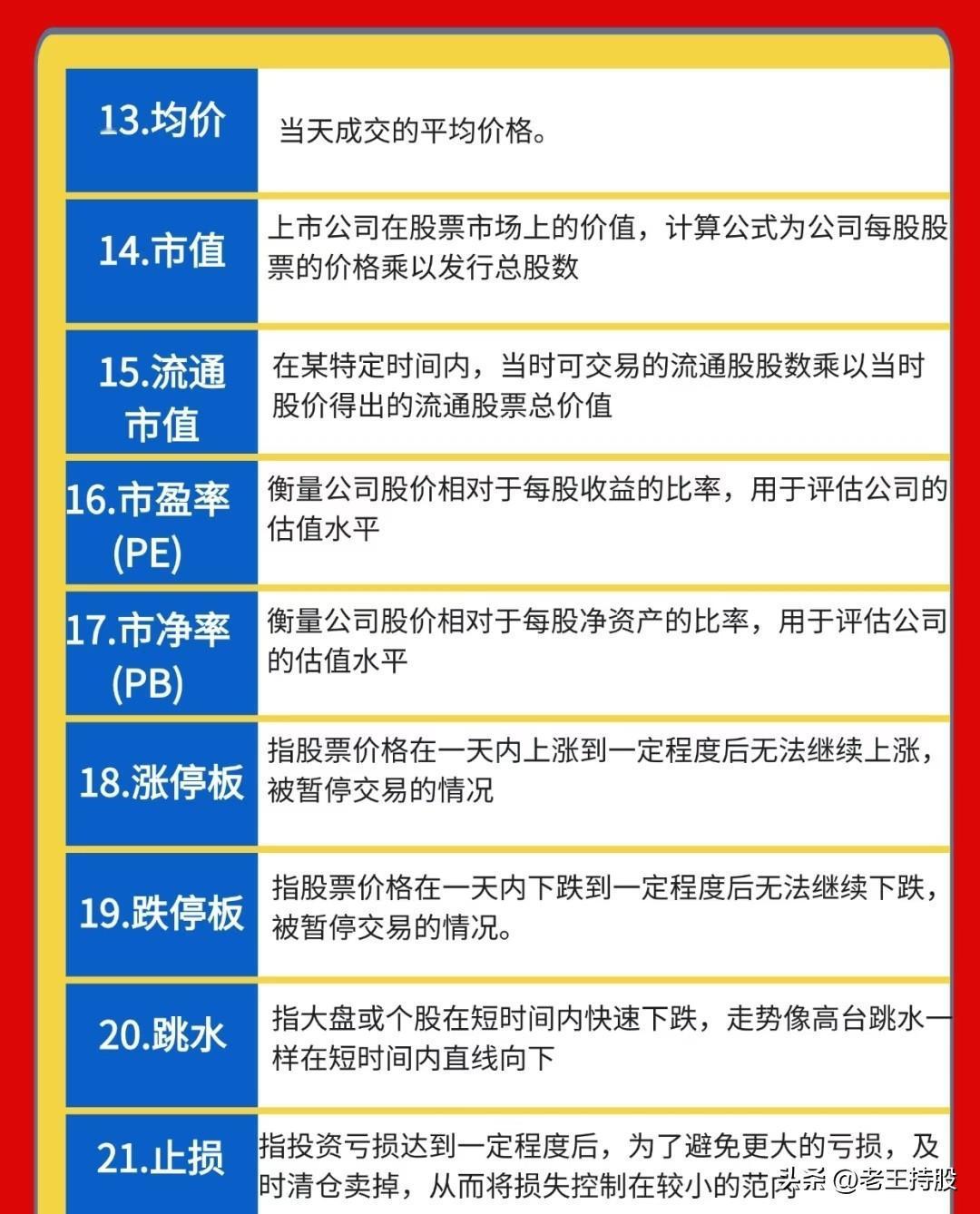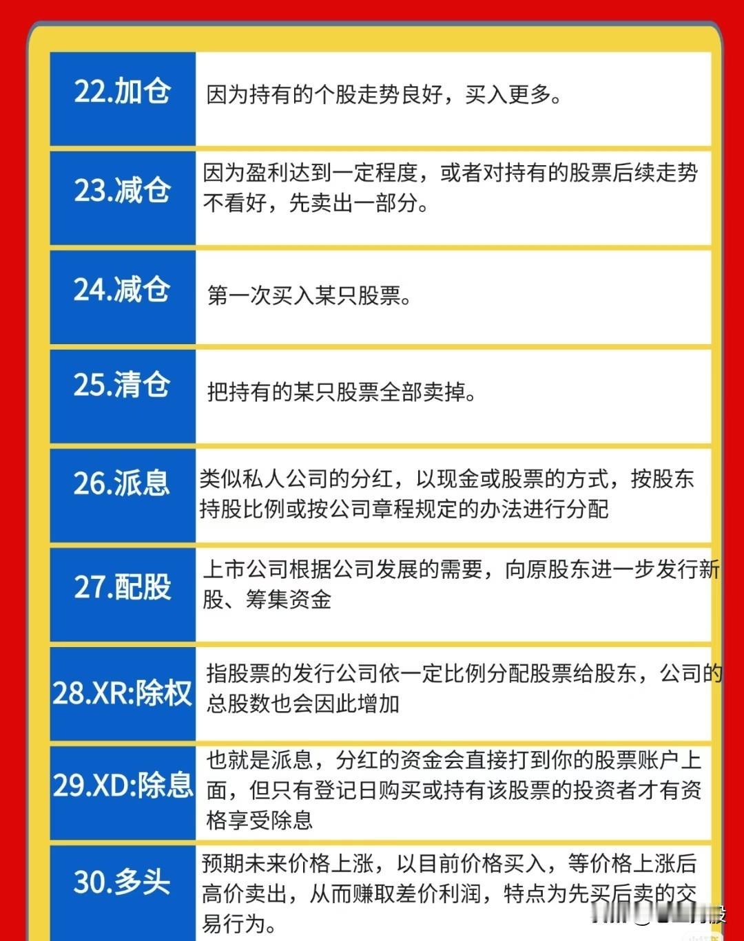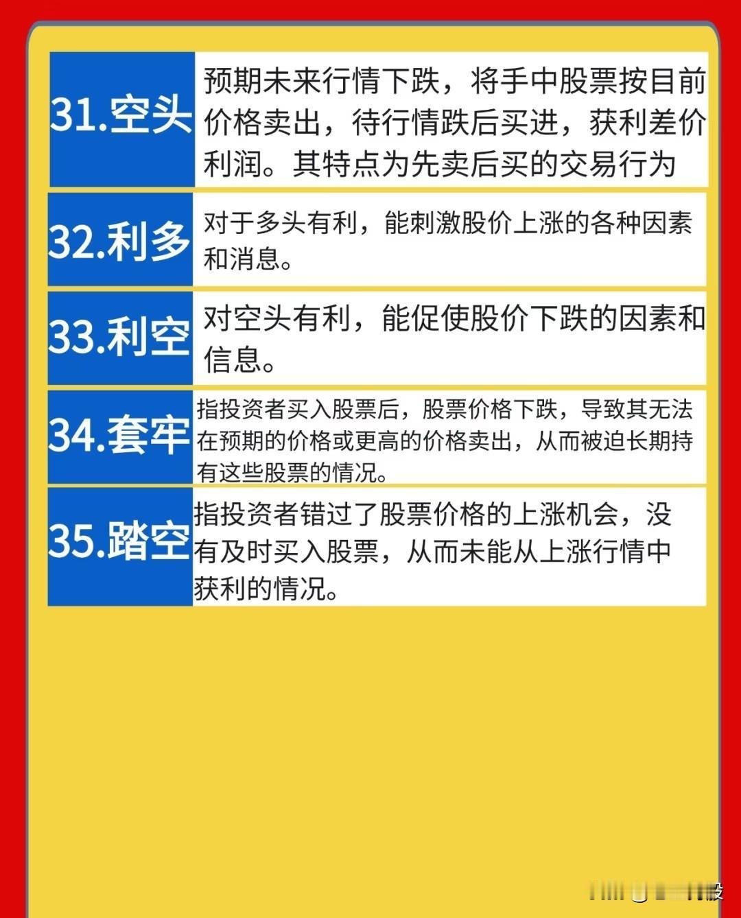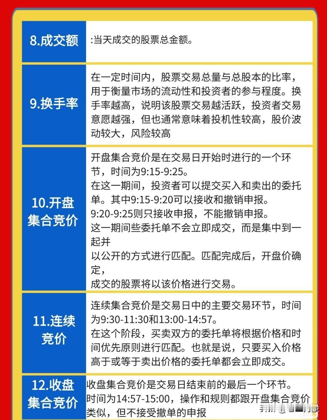 新手股民的股票专业术语科普信息图,总共介绍了35个常见的股票交易与金融市场相关术语,内容系统全面,由浅入深,帮助初学者理解股票市场的基础知识和常用概念。 1. 牛市:股市长时间持续上涨的趋势。 2. 熊市:股市长时间持续下跌的趋势。 3. 开盘价:每个交易日第一笔成交的价格,由集合竞价产生。 4. 收盘价:交易日最后一笔成交的价格,也是当日结算价。 5. 最高价:当天成交价格中的最高值。 6. 最低价:当天成交价格中的最低值。 7. 成交量:当天成交的股票总数量。 8. 成交额:当天所有成交股票的总金额。 9. 换手率:股票交易量与总股本的比率,反映市场流动性和投资者参与程度,换手率高通常代表交易活跃但投机性也较强。 10. 开盘集合竞价:在9:15-9:25进行,其中9:15-9:20可挂单也可撤单,9:20-9:25只可挂单不可撤单,最终通过撮合确定开盘价。 11. 连续竞价:在9:30-11:30和13:00-14:57进行,按照价格优先、时间优先原则实时撮合成交。 12. 收盘集合竞价:在14:57-15:00进行,规则类似于开盘集合竞价,但期间不允许撤单。 13. 均价:当天成交的平均价格。 14. 市值:上市公司在股市上的总价值,为股价乘以总发行股数。 15. 流通市值:流通股数乘以当前股价,代表当前可自由交易的股票总价值。 16. 市盈率 (PE):衡量股价与每股收益的比率,用于评估公司估值。 17. 市净率 (PB):衡量股价与每股净资产的比率,也是估值指标之一。 18. 涨停板:股价上涨到规定上限后暂停交易。 19. 跌停板:股价下跌到规定下限后暂停交易。 20. 跳水:指股票或大盘在短时间内快速大幅下跌。 21. 止损:当投资亏损达到一定幅度时,主动卖出以控制进一步损失。 22. 加仓:因看好某只股票而追加买入。 23. 减仓:因盈利达标或不看好后续走势,卖出部分持股。 24. 首次买入(图中误标为“减仓”):第一次购买某只股票。 25. 清仓:卖出某只股票的全部持仓。 26. 派息:公司向股东按持股比例分配现金或股票红利。 27. 配股:上市公司向原有股东发行新股以筹集资金。 28. XR(除权):公司分配股票导致总股本增加,股价相应调整。 29. XD(除息):公司派发现金股息,仅在股权登记日持有者可享有。 30. 多头:预期股价上涨,先买入再卖出以赚取差价的投资者。 31. 空头:预期行情下跌,先卖出再低价买回以获利的交易行为。 32. 利多:对股价上涨有利的消息或因素,通常利好多头。 33. 利空:对股价下跌有利的消息或因素,通常利好空头。 34. 套牢:买入股票后价格下跌,投资者被迫长期持有,难以在理想价位卖出。 35. 踏空:因未及时买入股票而错失上涨行情,未能获利。