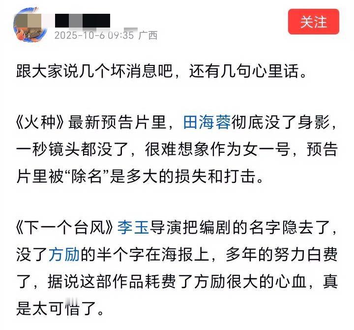 网上说《火种》AI换人,田海蓉都不在了! 但是我查看了下,并没有啊!田海蓉还在,而且上映时间也没变,是10月16日。 除了这个AI换人,还有说《火种》已经把田海蓉除名了,预告片里彻底没了身影,一秒镜头都没了…… 还有说田海蓉的公司“蓉海映像”,现在被金融局盯上了,连融资资格都悬了…… 我特地查了下,并没有这回事,猫眼的资料里,田海蓉还是女一号,排在富大龙、姜武后面,第三位置。而且播出时间并没有改,还是如期上映! 我搞不懂,为什么那么多人造谣?尽管有些人说与什么有关,但是都是没影的事啊!没有任何官方消息和证据证明,他们之间有任何关联。 但即使这样,依然被很多人抵制,谩骂。 我不是偏袒谁,我只是觉得很可怕,怎么可以这样随意给人扣帽子,这是要杀人啊!如果这个人是你,你自己作何感想?