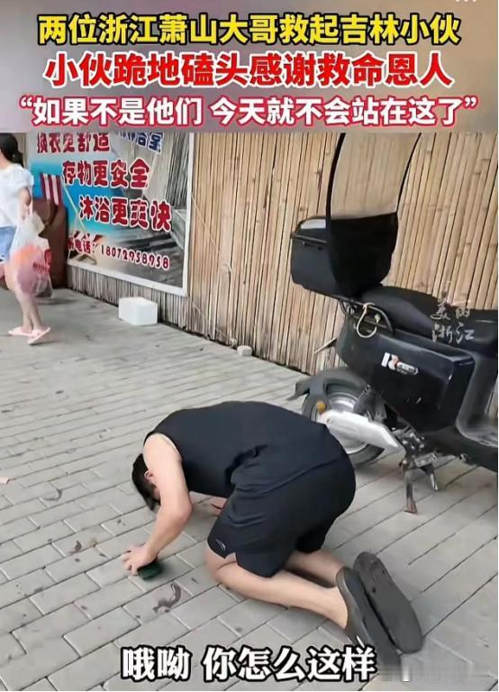 “大哥,我给磕个头吧......没有你们,我怕是活不成了” 8月的一个下午,杭州富阳某景区。吉林小伙周思宇在水边游玩,突然脚下一滑,掉进深水区。他拼尽全力呼喊“救命”,两位路过的萧山大哥没有丝毫犹豫,衣服都来不及脱,直接冲进水里,合力将他救回岸边。 其实这一切,都发生在短短几分钟内。 周思宇本想着水浅安全,结果一脚踩空,人就被水流带进深水区。 他呼吸困难、四肢乱划,呛了好几口水,恐惧中喊出最后一声“救命”。 两位萧山大哥听到呼喊,没多想就飞奔跳下水,动作干脆利落,合力将周思宇托起往岸边拖。 上岸那一刻,周思宇彻底松懈下来,跪地就要给两位救命恩人磕头。 两位大哥赶紧拉住他,憨厚地说:“别跪别跪,换谁都会这么做!” 但周思宇已经泣不成声:“对你们来说也许只是举手之劳,对我来说却是生死之间。” 人群中有路人用手机拍下了这一幕,有人感慨:“这样的好人,值得我们记住。” 事后,有人问两位大哥怕不怕危险,他们摆摆手说:“遇到这种事,根本来不及多想。” 救人时水很深,水流也不算平缓,但他们心里只有一个念头“救人第一”。 上岸后大哥们湿漉漉地喘着气,还不忘安慰小伙子:“以后玩水小心点。” 救人不图回报,被救的知道感恩,这才是社会最宝贵的温度。 在很多评论区,网友都赞“救命之恩当得起这一跪”。 也有人反思:如果遇到麻烦,是不是每个人都能像这俩大哥一样,果断出手、不计后果? 我们这个社会不缺好人,只是好事有时太普通,容易被喧嚣的社会噪音盖住。 有些人说“冷漠城市”,但这一跪,两位大哥的“别跪”,正好打脸了这种说法。 每个人都能在关键时刻出一份力,这世界才会更有温度。 别让冷漠成习惯,多一点“举手之劳”,也许某天就能救人一命。 你身边有没有遇到过这样的好人好事?你觉得“救命之恩跪谢”,是不是应该?