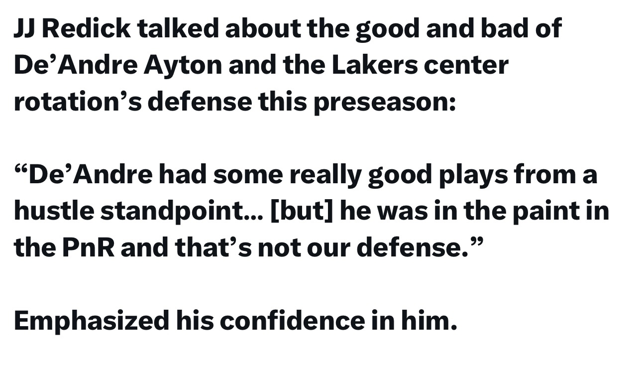 雷迪克赛后谈到了艾顿的优缺点,湖人的中锋位置在季前赛的防守表现: