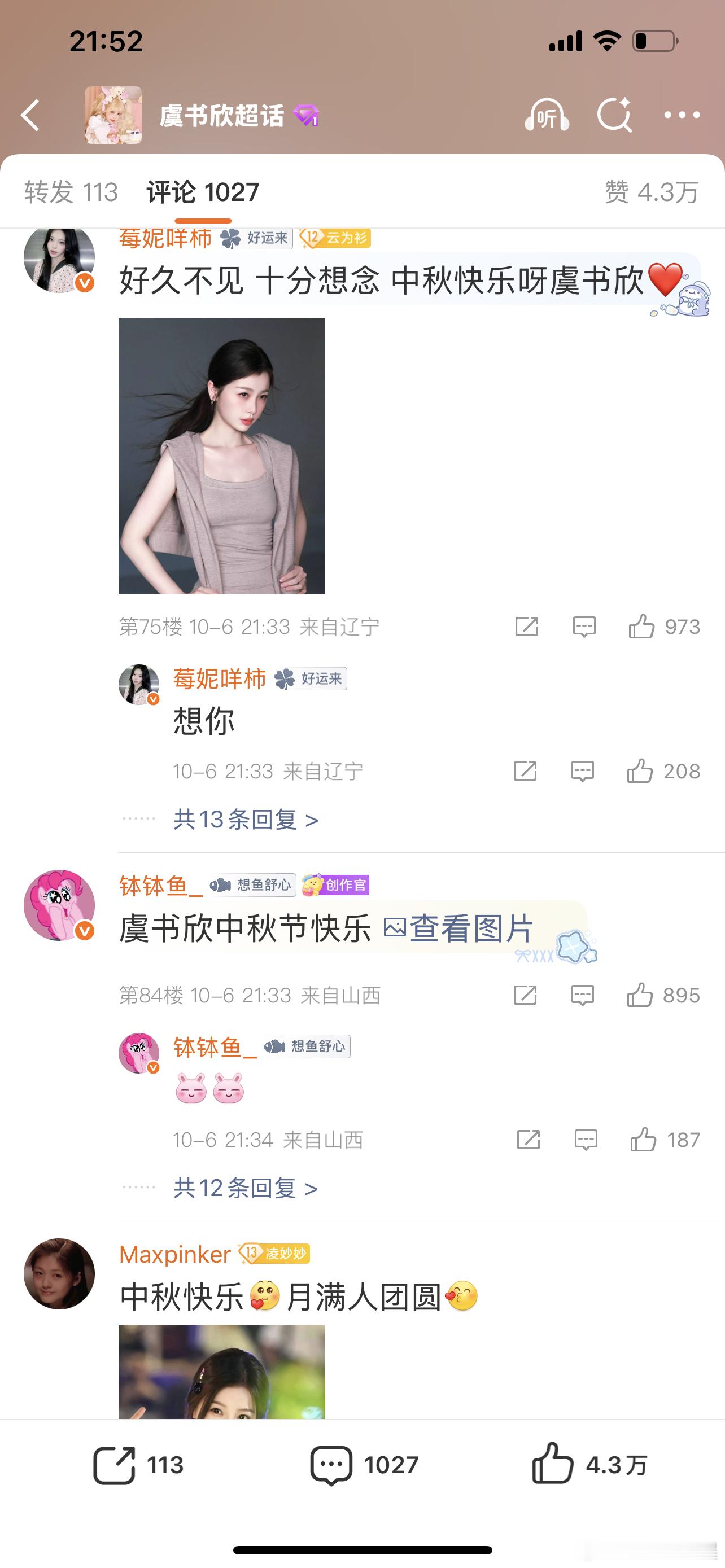 虞书欣工作室评论区一副岁月静好,是不是之前的事对她没啥影响了啊虞书欣祝中秋快乐