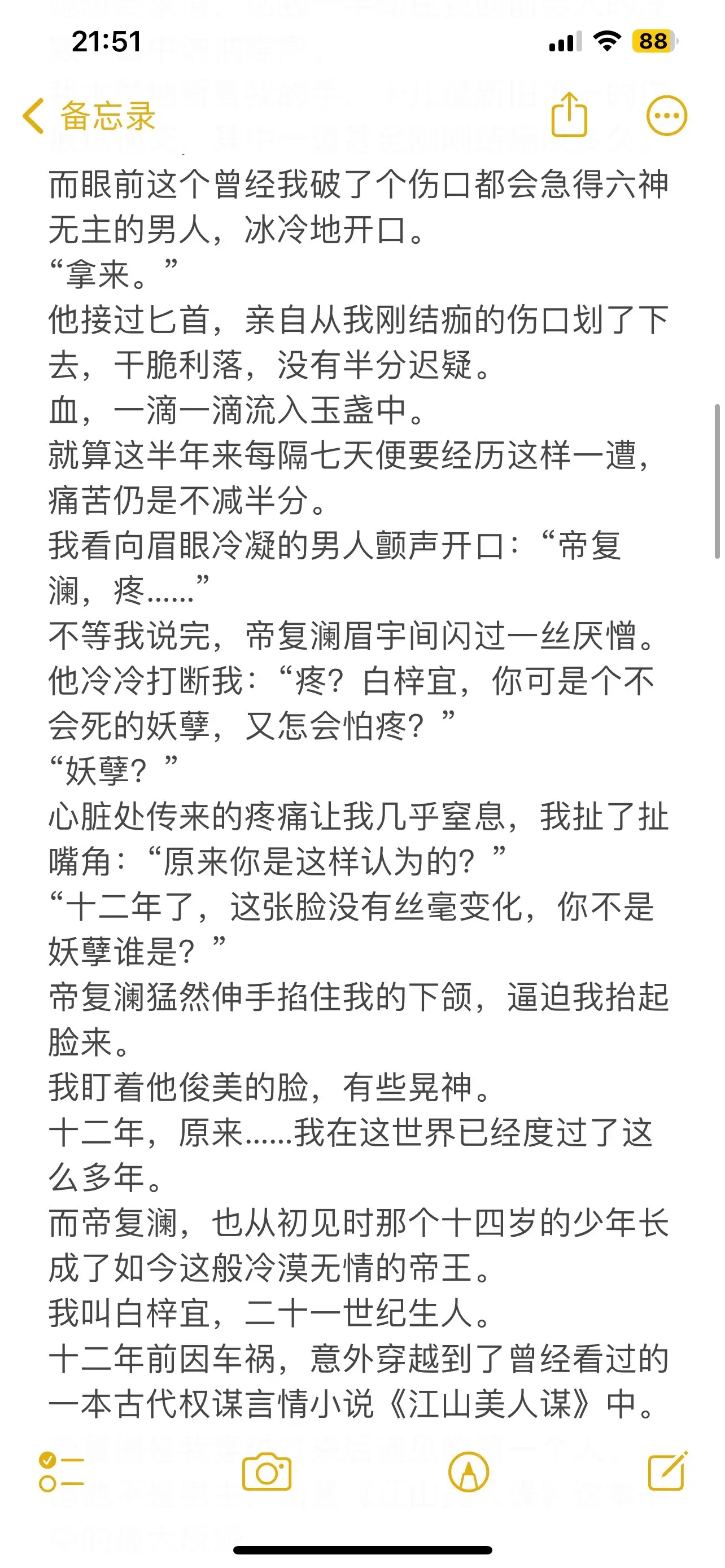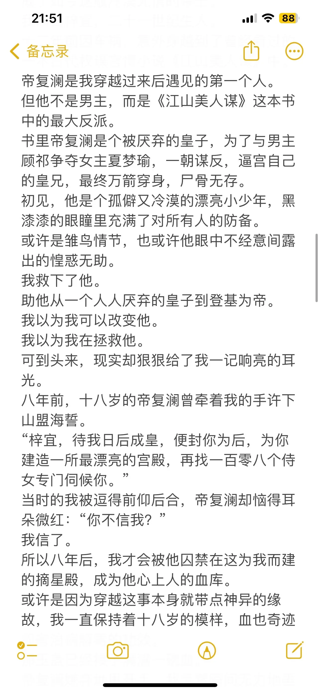 🍂十二年前因车祸,意外穿越到了曾经看过的一本古代权谋言情小说中。帝复澜是我穿越过来后遇见的第一个人。但他不是男主,而是这本书中的最大反派。我以为我可以改变他。可到头来,现实却狠狠给了我一记响亮的耳光。