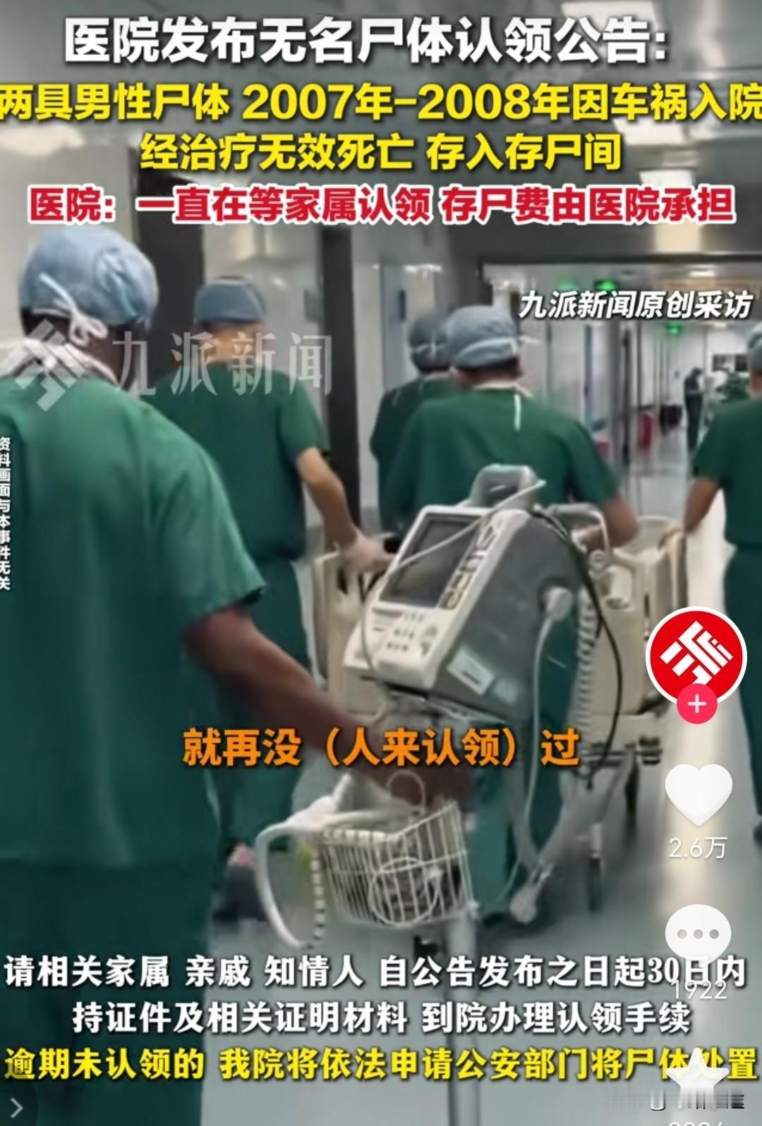 据九派新闻报道:乌兰察布市医学高等专科学校附属医院发布一则尸体认领公告:两具男性尸体 2007年-2008年因车祸入院 经治疗无效死亡 存入存尸间 医院强调:一直在等家属认领,存尸费由医院承担。请相关家属 亲戚 知情人发布公告日起30日内持证件及相关证明材料,到院办理认领手续。 乌兰察布市高等专科学校附属医院 乌兰察布医疗