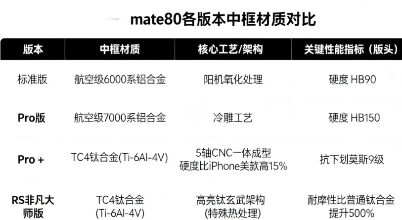 在店里看见华为Mate 80的宣传海报,标准版用的是普通铝合金,Pro版多了一道工序,看起来亮一些,Pro+和RS版直接换了钛合金,还说叫什么玄武架构,说耐磨性比之前强了不少,这些说法还没官方证实,可已经传得到处都是。