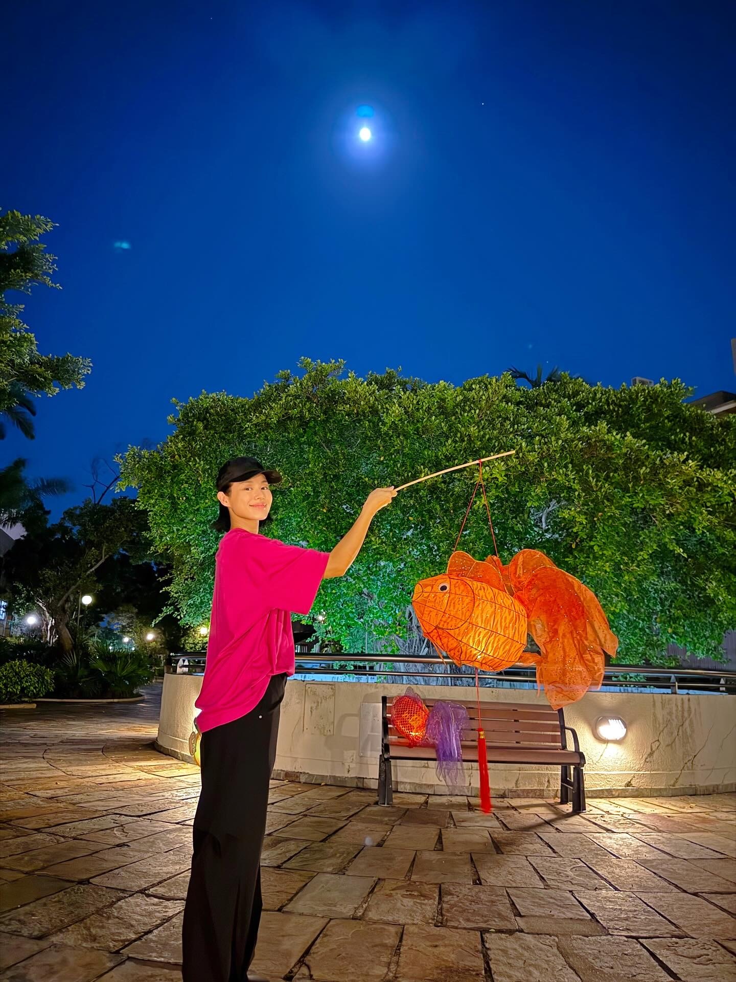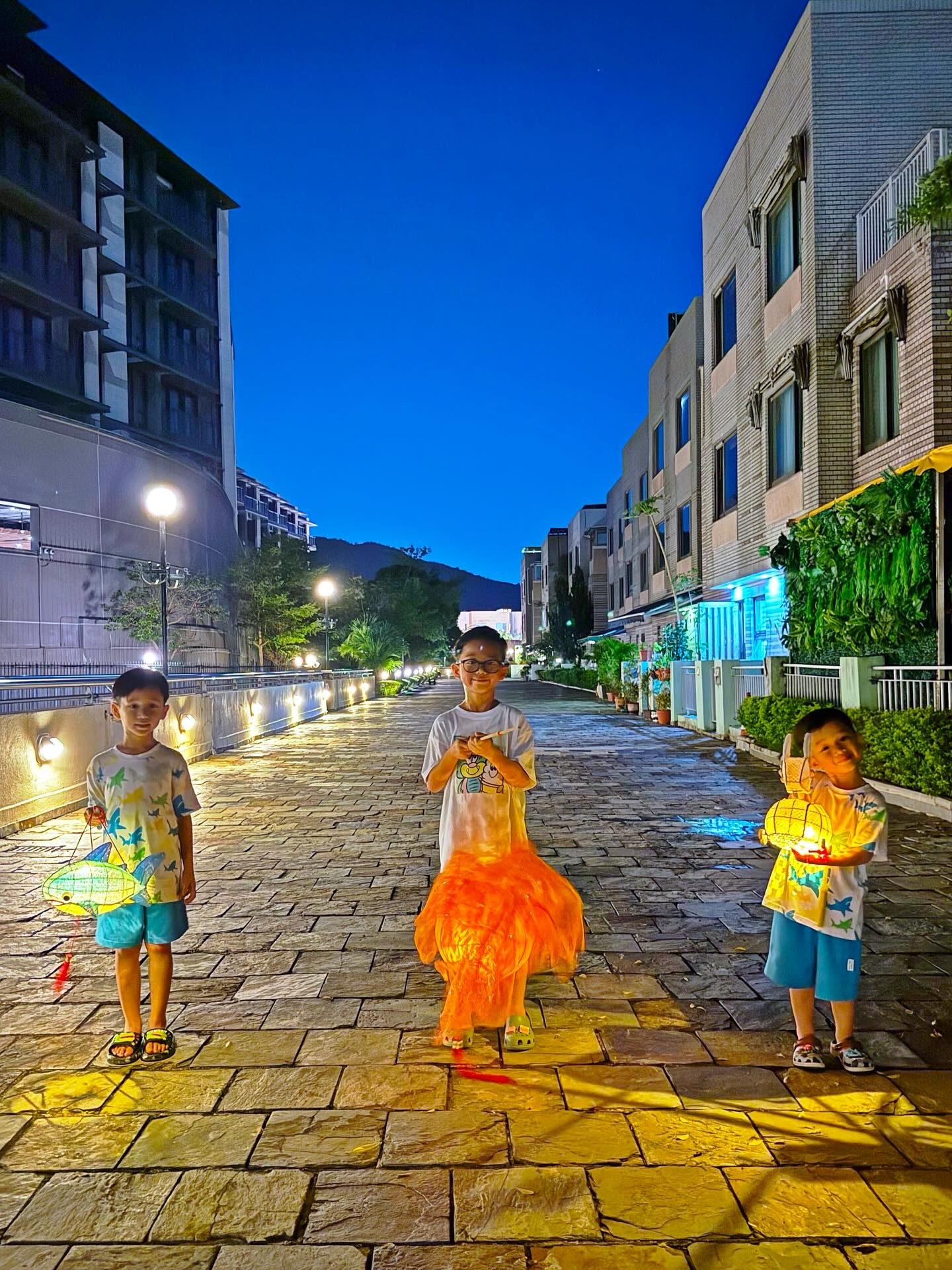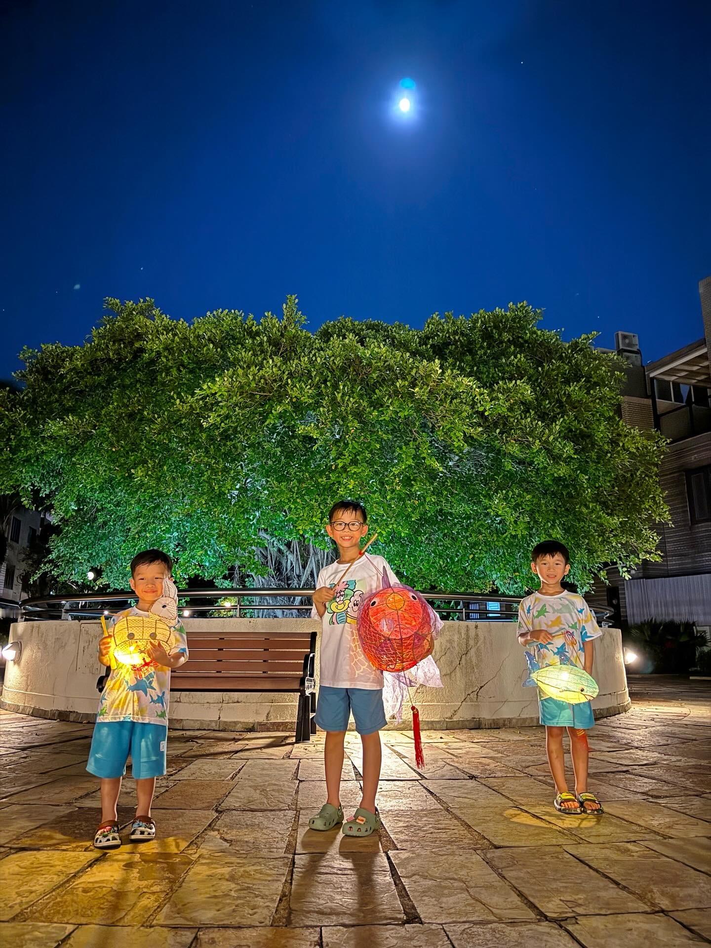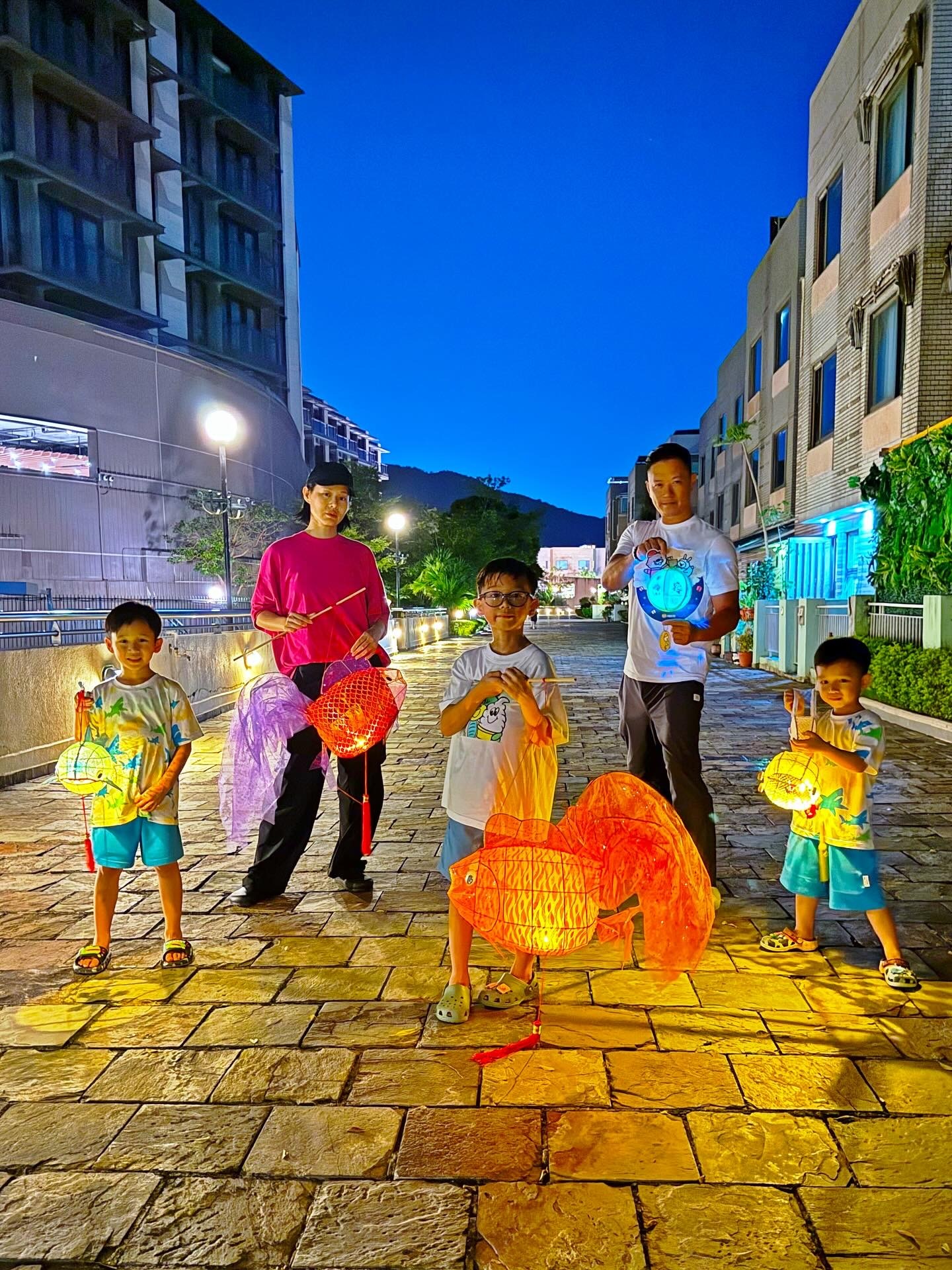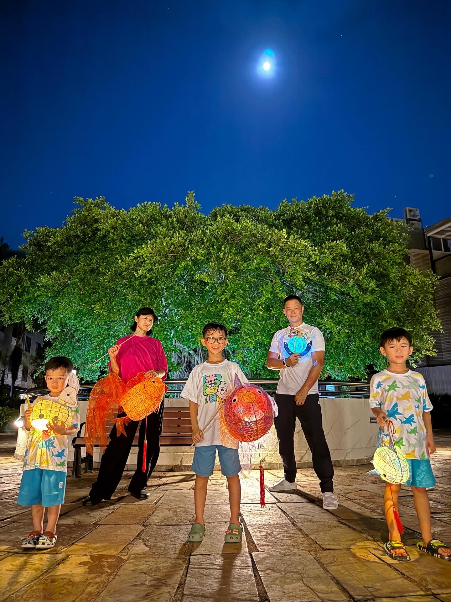 中秋节,胡杏儿和老公带着三个儿子玩灯笼。
