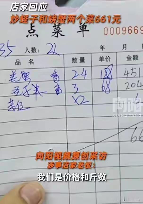 广东惠州“小径湾餐厅,”被顾客投诉,店家喊冤,到底冤不冤。 你看他这两只螃蟹还2.4斤,两只加起来有1斤二两?还有一盘蛏子3斤。谁也别狡辩,有种你重新拿两只共重2斤4两的螃蟹,3斤蛏子,再炒两个菜,黑白是非,让网友评评理。宰没宰客,一目了然。当地文旅部门应该站出来,调查清楚游客和店家,到底是谁的问题,要维护好当地的名誉。名声一旦臭了,一损俱损,想恢复就难了。 看看我在烟台芝罘区东口海市上,15元一斤买的3斤螃蟹,也能摆三个盘,我们家的盆肯定比饭店盘子大。游客可以买了,让店家加工。蛏子一斤15~20元,3斤也能炒一盆。 不怕不识货,就怕货比货。想吃海鲜,还是到我们山东烟台来。价格实惠,风景优美,朴实的胶东人,让你感觉到大海的壮美胸怀。