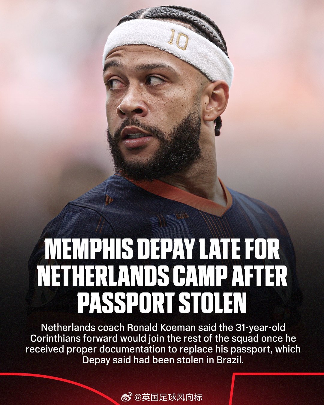 【护照被偷!德佩推迟归队】目前在科林蒂安效力的31岁荷兰国脚,孟菲斯-德佩,由于个人护照在巴西被偷了,无法在当地机场登机飞回欧洲,所以将会推迟回国家队报道和集训。