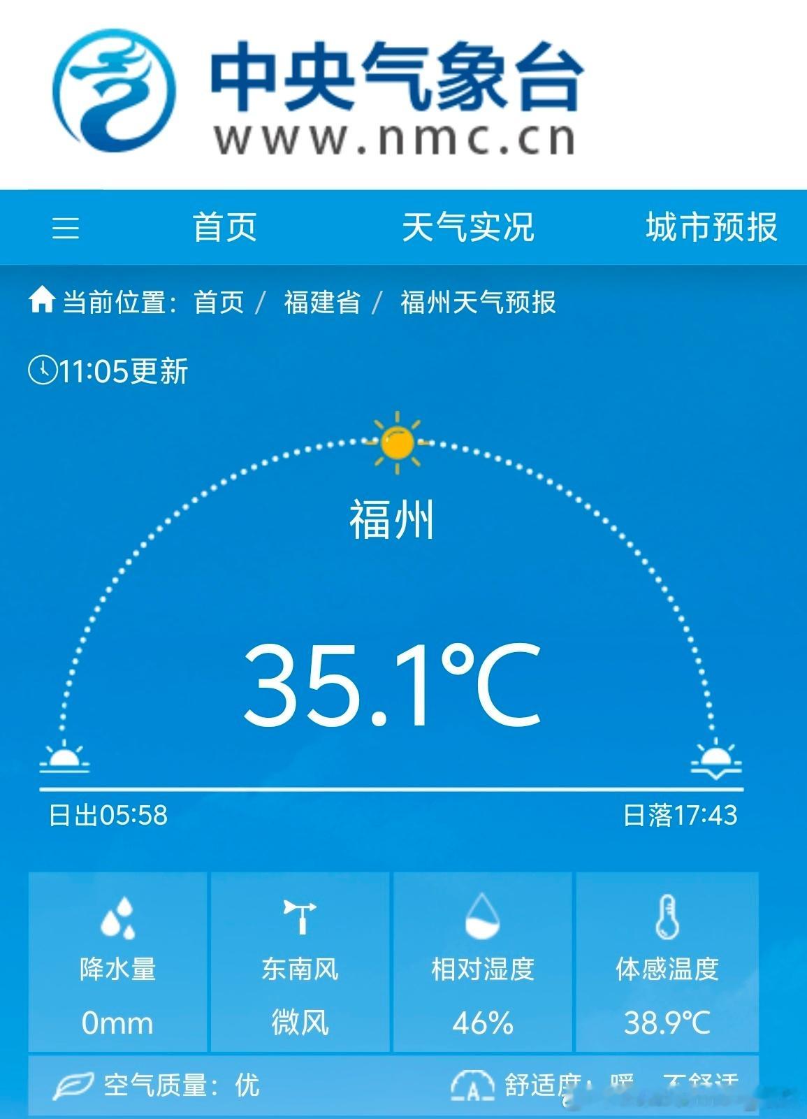 【高温】今天11时05分,福州越过35℃高温线,拿下今年第71个高温日。10月以来已经连续7天高温,创造当地10月连续最长高温和10月最多高温日数纪录。而且今天高温来得早,看下午福州是否会冲击5日刚创下的38℃10月最高气温纪录。此外11时气温榜,浙江常山继续领跑,后面江西一堆站点紧随其后。