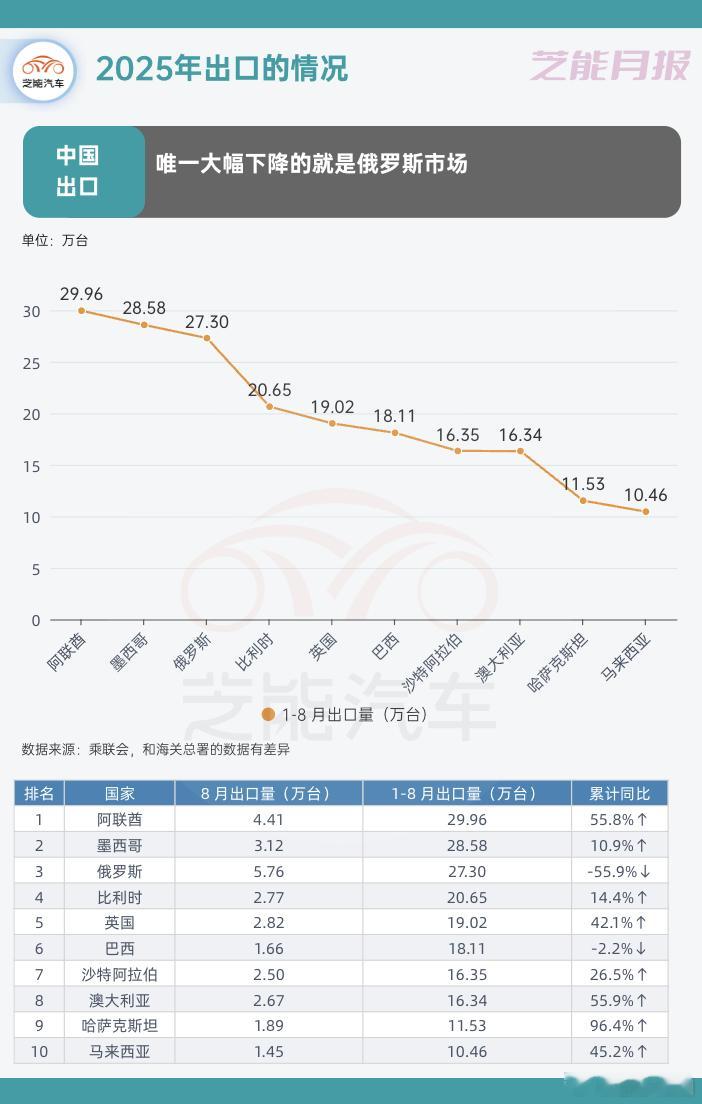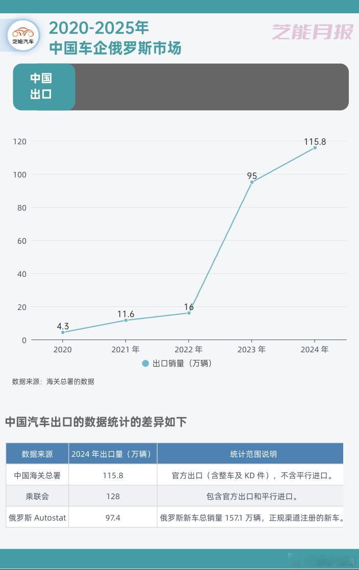 2022-2024 年,欧美车企撤离俄罗斯,中国汽车借势崛起,市占率从不足 5% 升至近六成,2024 年出口 128 万辆。2025 年俄市场遇冷,整体销量降 18.7%,中国品牌出口腰斩,奇瑞等销量大跌。