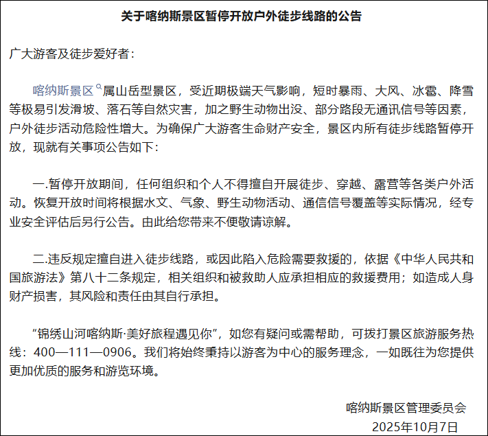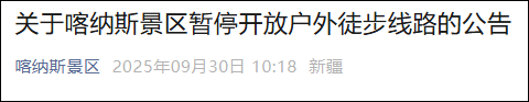 9月30日,喀纳斯景区就曾发布过暂停开放户外徒步线路的公告。
