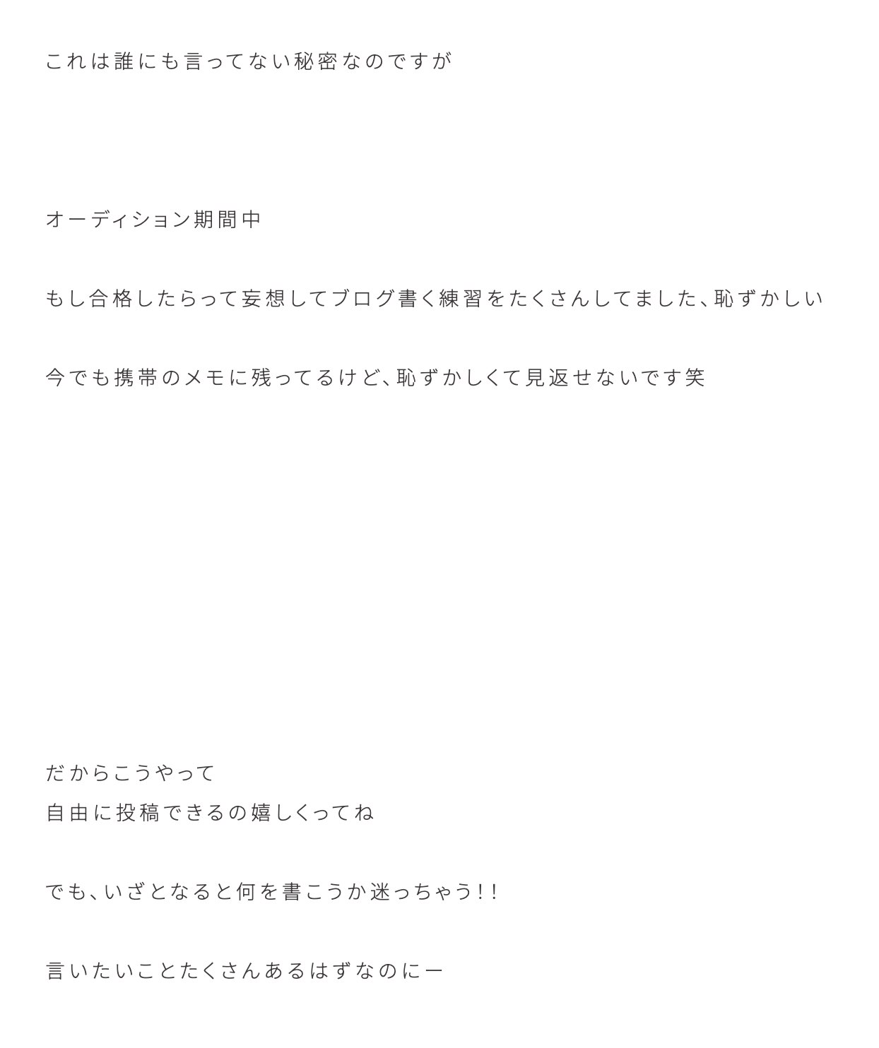 中川智尋「私ね、最初のブログでも言ったんだけど、先輩方のブログを読むのが本当に好きで。文章にはその人の内面が映るって言われているように、ブログを読んでいるとその人のことをたくさん知れる気がするんです。だからね、みなさんに私のことたくさん知ってほしいから、これからたくさん更新しようと思います!(じぶんなりに、、、)」