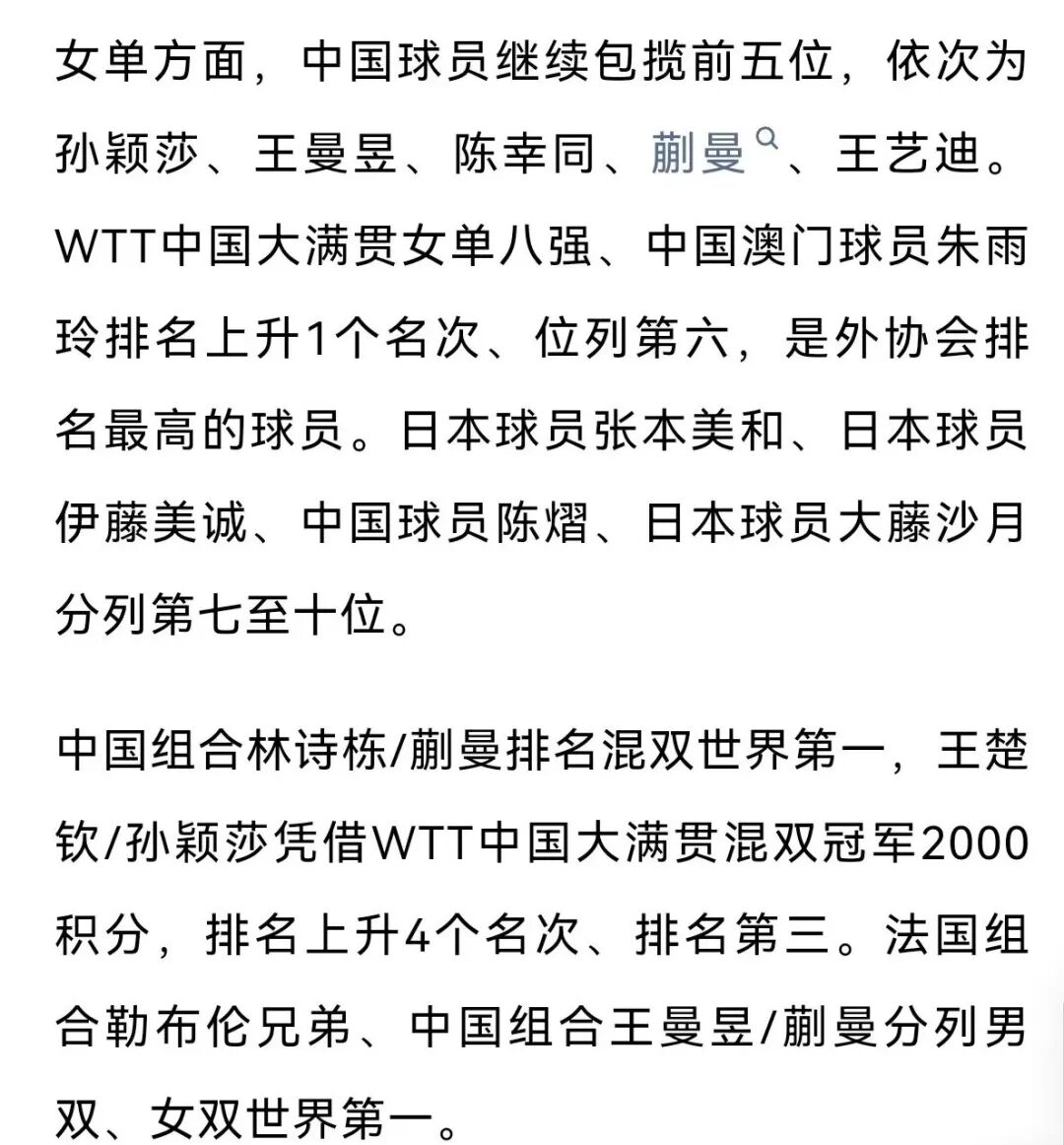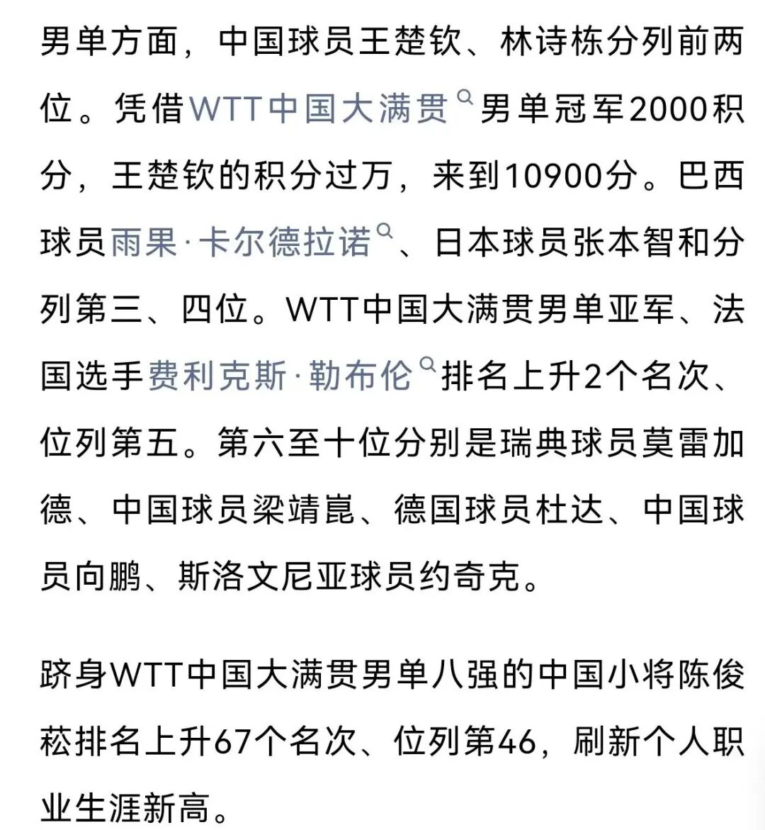 乒乓球最新世界排名公布,王楚钦、孙颖莎继续领跑榜单,积分过万,小将陈俊菘排名创新高