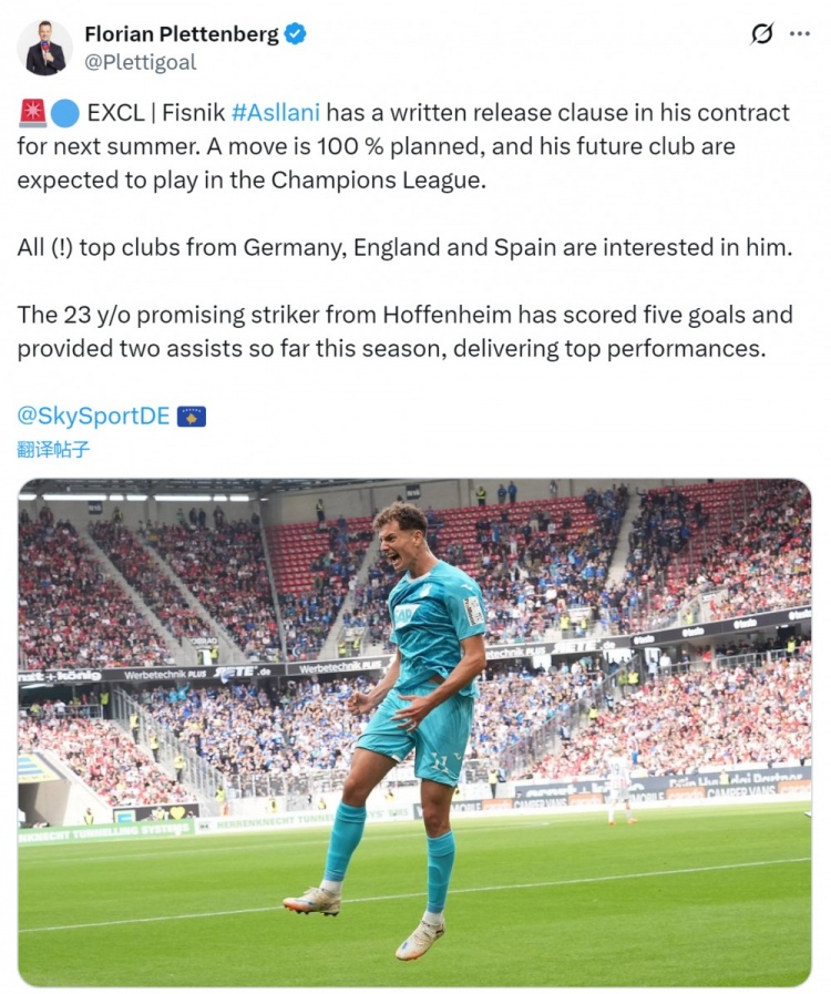 直播吧10月7日讯据德国天空体育记者普莱滕伯格报道,多家顶级俱乐部有意霍芬海姆23岁前锋阿斯拉尼。