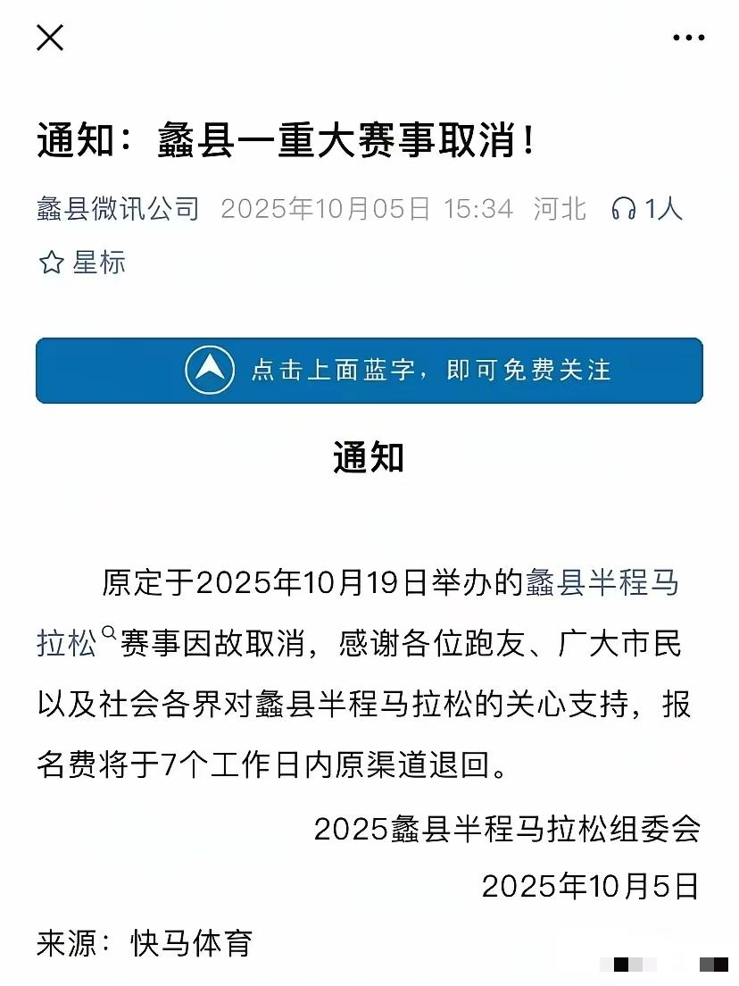 说句可能不该说的话,县城马拉松早该取消了!马拉松泛滥,扰民严重,需要精简了! 县太爷都要面子,别的县都搞,咱不搞多没面子,搞!劳民伤财跟自己无关。 刺激消费就是封个路,问题不大。准备赛事需要投入大量精力,可能影响其他重要工作开展。