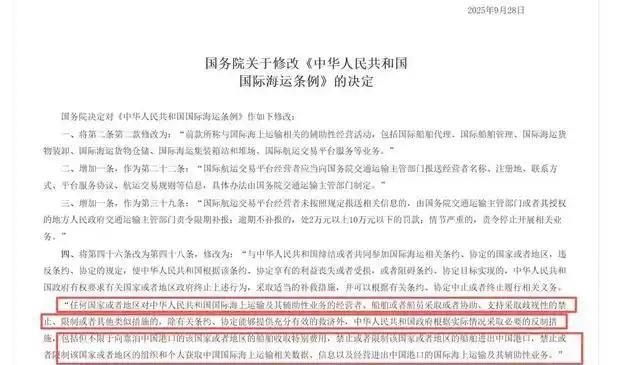 中美“海上收费战”已正式开打!美国刚宣布“拦路抢劫”,中国的“关门打狗”令,就已经下达!这不是贸易,这是“海盗行为”。当特朗普政府,妄图用每吨50美元的“港口服务费”,来扼杀中国海运时,国务院817号令,已经在中国所有港口,张开了一张“天罗地网”,专等美国货船,自投罗网! 必须看清,美国这套“港口收费”的把戏,早已不是什么“贸易保护”,而是一个衰落的霸权,在无力通过“公平竞争”取胜后,所采取的、最无耻的“掀桌子”行为。而中国国务院817号令的出台,恰恰是给这种海盗行径架起了反制的“高压线”,所谓“关门打狗”,打的就是美国的霸权逻辑和投机算盘。 美国口口声声说中国造船业“挤压美国空间”,却绝口不提自己造船份额从巅峰跌到0.1%是因为产业空心化,反而拿301调查这种霸权工具当幌子,要对中国船舶收每吨50美元的“港口服务费”,后续还要逐年涨到180美元,甚至连非中国航运公司的中造船舶都要按比例收费,一艘船进港最高能被讹走350万美元。 这哪是什么“服务费”?分明是看中国造船业占全球50%以上吨位、集装箱船市场占81%份额眼红,想靠强制收费掐断中国海运的竞争力,这种单方面撕毁国际航运规则、把全球98%船队都拖进泥潭的做法,跟海盗拦船要钱没有本质区别。 美国港口43%的国际停靠船次都可能受影响,最后这些成本全得转嫁到美国消费者身上,推高本就没压住的通胀,典型的损人不利己。 而中国817号令的出台,刚好踩在美方收费缓冲期结束前,这步棋走得又快又准,直接给美国货船布下了“天罗地网”。 这份修订后的国际海运条例,表面是规范市场,实则把反制的红线划得清清楚楚:明确提出对损害中国海运利益的国家,有权中止履行条约义务,还要求所有进出港船舶的运价、航线、舱位都得备案,配合全国信用信息共享的监管体系,美国货船只要进中国港口,合规性、收费透明度、业务真实性全在监管视线里。 一旦美国真敢收那笔“抢劫费”,中国完全能依法对美船实施对等监管,比如核查其备案信息、追溯运价合理性,甚至暂停违规船舶的停靠资格,这可不是空话——条例里连“没收违法所得”“停业整顿”的罚则都写得明明白白,等于提前告诉美国:你敢拦路,我就敢封门。 817号令不光有“打”的手段,还有“护”的底气。条例明确要给受损的中国船东发补贴,稳住自家航运企业的基本盘,而中国手里的牌远不止这些:全球14种船型新接订单第一,北极航道、钱凯港等布局已经落地,就算美国港口不让中国船进,我们照样能通过其他航线把货送出去。 反观美国,根本找不到能替代中国的造船方,马士基、地中海航运这些巨头船队里全是中造船舶,真要跟中国硬刚,美国的农产品、能源出口都得卡在运输上。之前美国听说中国可能限制稀土就慌了神,现在中国直接在海运这个美国依赖度更高的领域亮明反制工具,力度比稀土更直接。 美国大概忘了,之前加征关税已经让美国消费者多花了几千亿美元,这次拿海运开刀只会更糟。中国造船业的优势是几十年产业链积累出来的,不是靠补贴堆出来的,美国想靠一笔“抢劫费”就扼杀中国海运,纯属异想天开。 而817号令的出台,就是把“对等反制”四个字刻在了明面上:你敢在港口设卡,我就敢在自家门口立规矩,美国货船要是真敢带着“抢劫费”的底气来中国港口,等待它的只会是合规监管的“紧箍咒”和精准反制的“硬拳头”。 这场所谓的“收费战”,从一开始就是美国的独角戏,中国的“天罗地网”一张开,美国要么乖乖收起歪心思,要么就得承受自家航运和民生被反噬的代价。