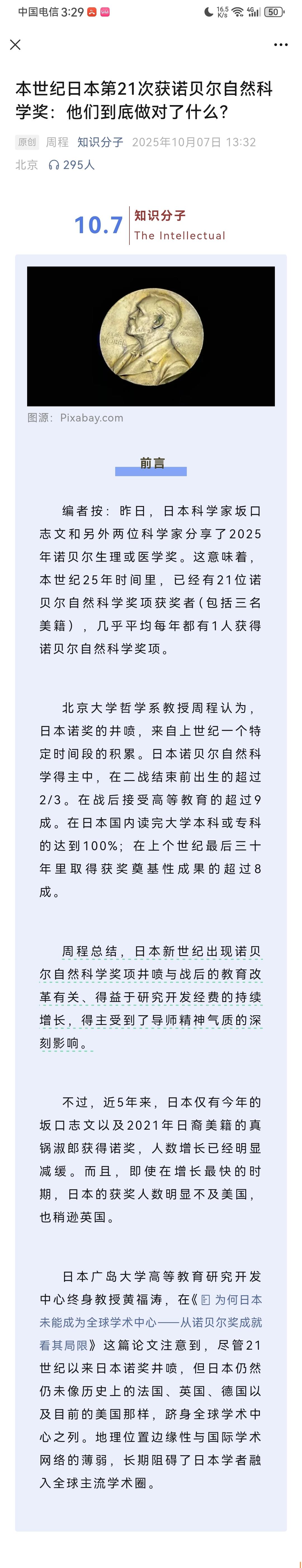 为什么日本能够涌现那么多的诺贝尔奖获得者?北大著名教授周程10月6日在知识分子撰