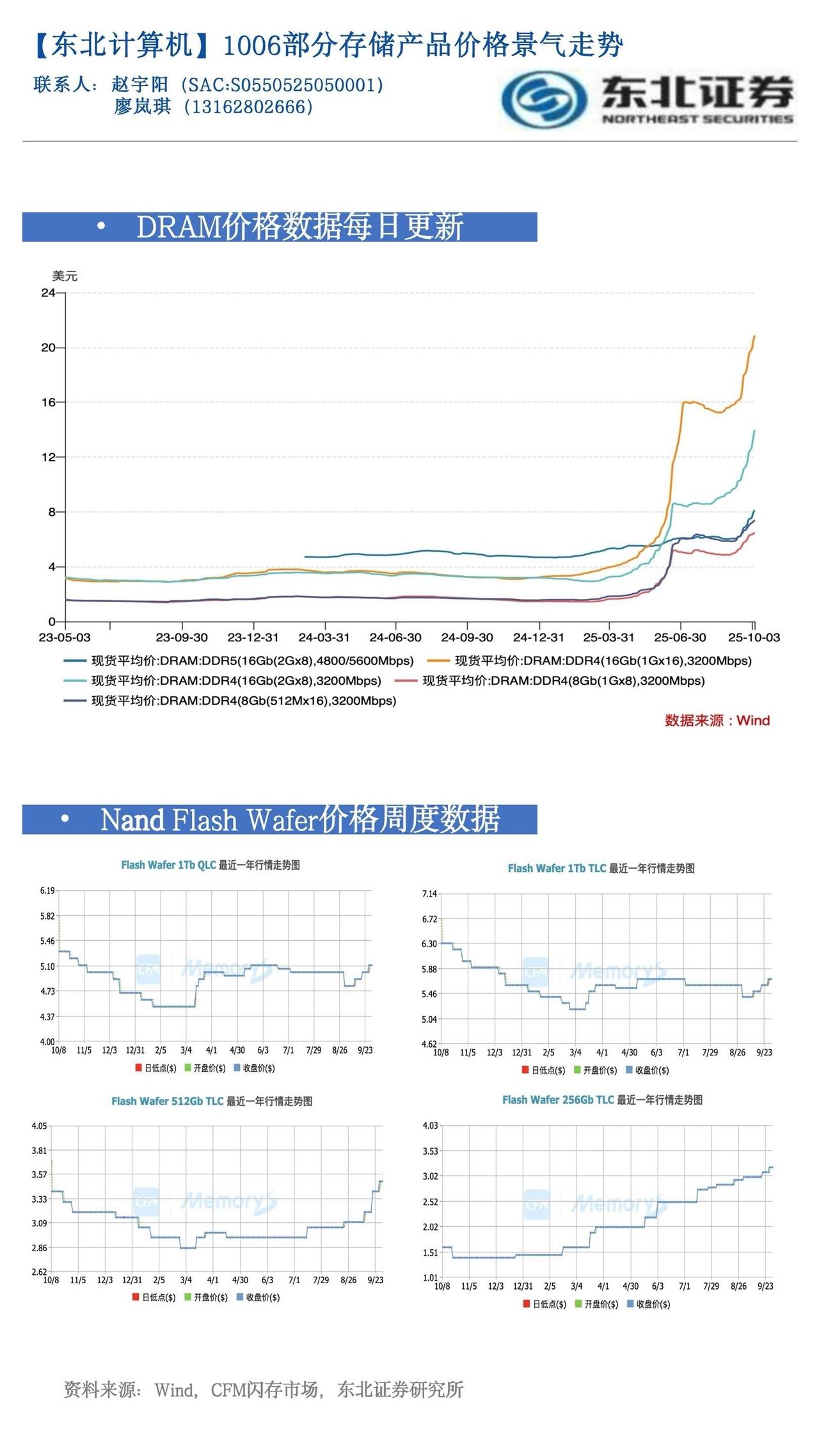 【国金电子】每周存储价格更新:9月NAND与DRAM涨幅开始重新扩大 [太阳]NAND Flash:小容量,本周64/32/2/1Gb均价为6.185/3.568/1.076/0.96美金,相较上周同增0.41%/0.68%/1.41%/0.73%,相较上月同增0.03%/0.68%/4.06%/4.58%,涨幅略扩大。大容量,本周1Tb QLC/1Tb TLC/512Gb TLC/256Gb TLC wafer均价为5.1/5.7/3.5/3.2美金,相较上周持平,相较上月同增2.0%/1.8%/12.9%/8.5%,稳中有升。 [太阳]DRAM:本周DDR5 16G/DDR4 16G/DDR3 4 G均价为8.129/20.87/2.413美金,相较上周同比+8.75%/+6.70%/+4.91%,相较上月同比+34.36%/+32.82%/+26.40%,过去一月现货价涨幅扩大。 [太阳]NOR Flash:本周512k-2Gb主流料号价格无变动。 数据来源:dramexchange、CFM、贸泽电子等,本周逢假期CFM部分数据未更新。
