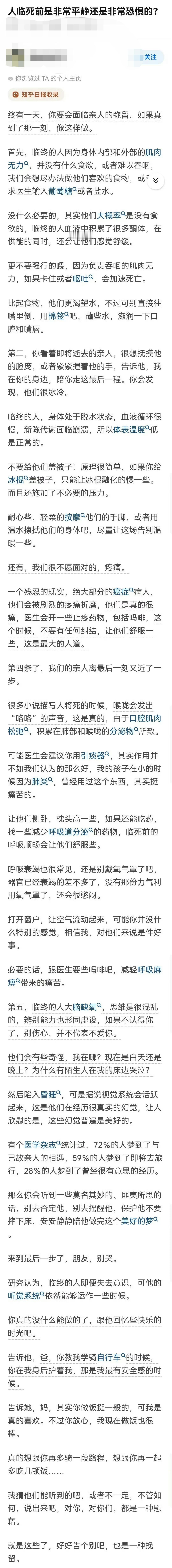 这篇《人临死前是非常平静还是非常恐惧的?》,文章很短,虽然都是很朴素的文字,但是