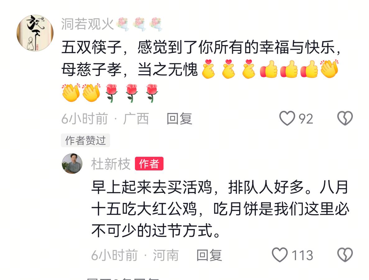 郭威陪杜郭过中秋节! 一盒包装精美造型别致的月饼,被老杜做了两个作品,发了两次,可见份量之重要。 中秋节这天,老杜又发了一桌菜,五双筷子,大红唇评论说,五双筷子,感受到了你的幸福和快乐,母慈子孝,当之无愧。 老杜没有正面回答,说早上排队买得大公鸡。吃大公鸡和月饼是我们这里过节必备。 大红唇也发了作品,这一桌饭,一盒月饼,演绎者离奇曲折的故事,年迈的驻马店慈母,用精美的国瓷,与不是亲生胜似亲生的儿子,一起围炉煮茶,进餐赏月!这样的母慈子孝彰显中华美德! 看来郭威过年过节去看望郭杜不假,毕竟被郭杜养了二十八年,养一个小猫小狗也会产生感情,但是作为儿媳妇田大,应该没去,因为堂嫂明白的说过,看不起田家做的事,已经绝交了。 唐嫂也说过,以后郭杜动不了了,在驻马店,靠郭威养老,郭威给他们送个馒头端碗饭,如果他们回老家,是他们侄子侄媳妇的事。 小熊啊,这就是郭杜的退路,你还不清醒吗,把你拉上站车,上被告台是你,进笼子是你,他们都可以安全上岸,你呢,成了二十一世纪最大背锅侠! 小熊,站出来吧,揭露郭杜,揭露三拒的前因后果,告诉他们,你是被指使者,不要当枪子了!