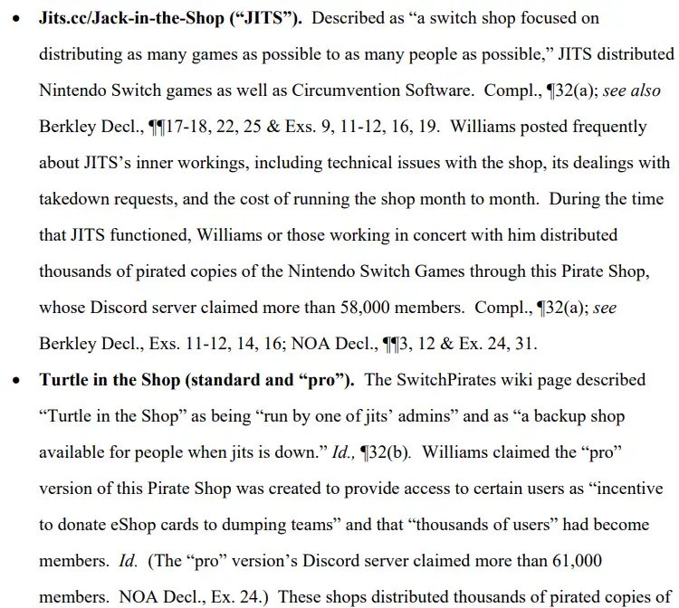 诉状概述了据称由威廉姆斯创建和维护的复杂盗版运营网络,每个网络都是非法获取的任天堂Switch游戏的集散中心。其中包括拥有超过58,000名Discord成员的流行盗版商店JITS;被描述为拥有超过61,000名用户的备份服务TurtleintheShop;以及据称在投诉时提供超过33,000款任天堂游戏数字副本访问的LiberaShop。威廉姆斯还被指控担任Reddit社区"SwitchPirates"的高级版主,该社区在高峰期积累了近190,000名成员。
