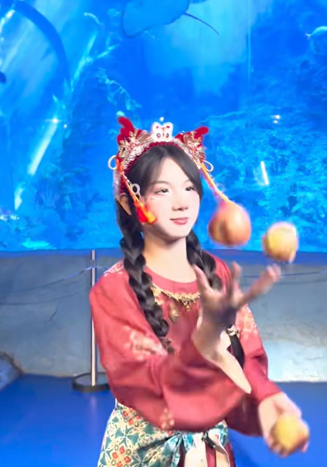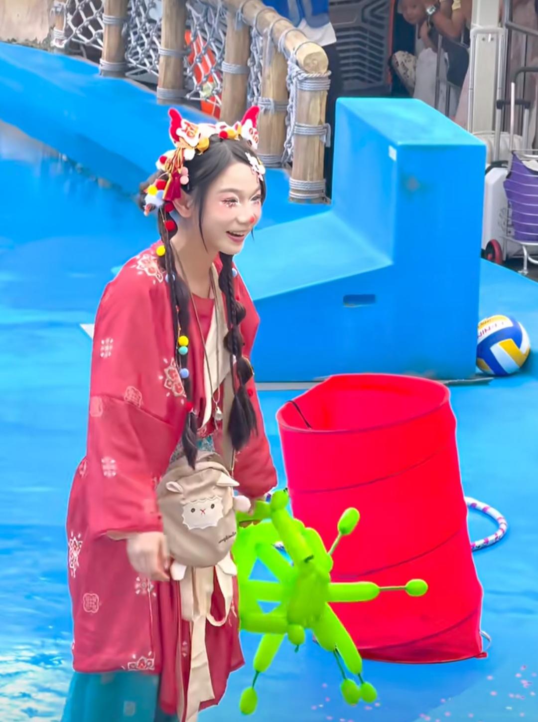 小丑冰冰看起来很解压,不知道为什么,一个女孩子,居然可以那么可爱! 呆萌的样子,让她颇有观众缘,所以与游客们互动一点障碍都没有。 不过当初练习杂耍苹果的时候,没少遭罪,还好她挺下来了。