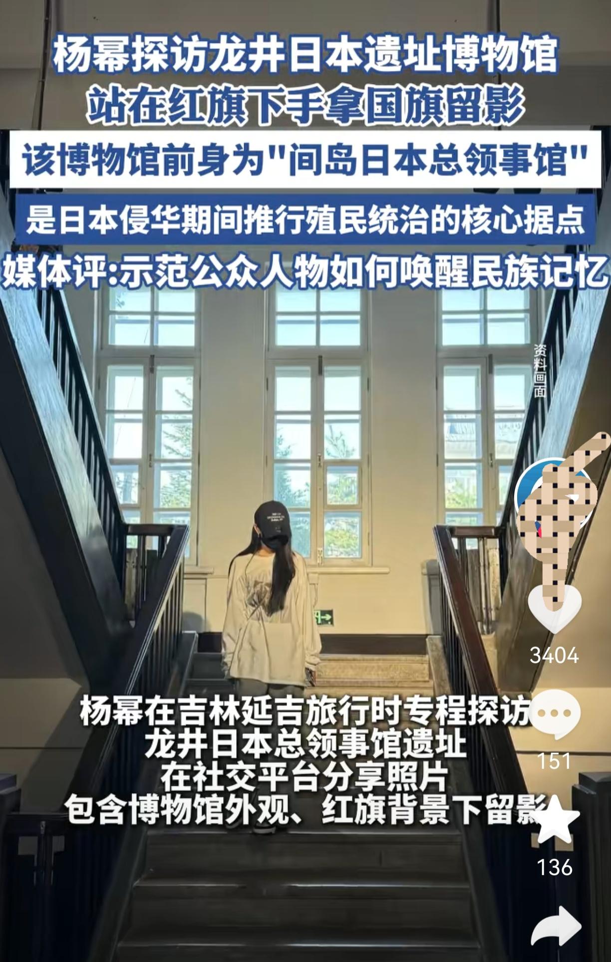 大家发现没有? 杨幂这趟旅行太会选了, 国庆大家挤热门景点,她偏去了龙井日本遗址博物馆。 那地方不是网红打卡地,却藏着段该铭记的历史。 她穿得简单,看红旗还拍照,网友都喊她爱国主义幂幂,这哪是普通旅行,分明是把历史装心里了,放在行动上。 好多人第一次听说这博物馆。 本来小众没人知,她这一去,现在成了大家讨论的历史宝藏。 明星打卡不只是热闹,她是用行动让历史从课本里走出来,变成能摸能看的见记忆,这才是旅行该有的意义。 这样的明星打卡,大家都打心底里觉得赞,你喜欢这样的杨幂吗?