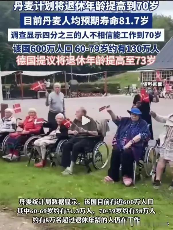 欧洲的老牌资本主义国家的高福利也将不复存在了!看下图,刚刚看到《新浪财经》今天的文章,说德国议员建议将德国人退休年龄延长至73岁,德国现在的退休年龄已经到67岁了,德国人的平均寿命约为80.5岁,其中男性平均寿命约为78.5岁,要是真的提高到73岁领退休金,那男性很吃亏,没多少人能拿的到退休金。 另外,北欧丹麦也计划将退休年龄延长至70岁,丹麦人平均寿命81.7岁,意大利的年轻人要拿退休金恐怕要到71岁。 这些曾经令人羡慕的高福利国家现在都如出一辙地延长退休年龄,说明“地主家余粮也不多了”,在人口老龄化加剧,欧洲结婚率低,少子化延续,年轻劳动力短缺以及养老金体系承压的五大因素冲击下,老牌资本主义国家的传统高福利模式已难以为继,现在不得已地正进入调整的阶段。