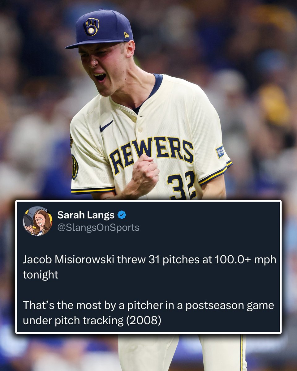 MLB官方X账号发推特报道,JacobMisiorowski在他的季后赛首秀中表现火热