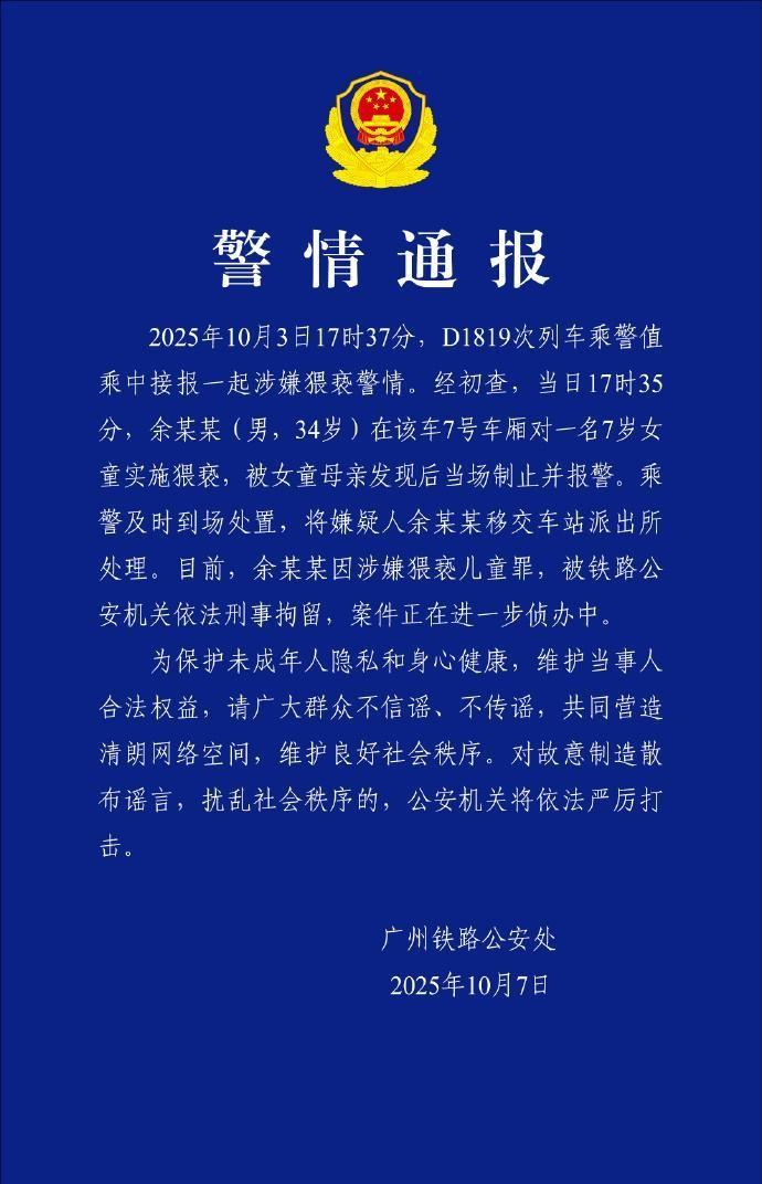 猥亵!“又亲又摸陌生女童”男子被刑拘! 据媒体此前报道,近日,广东一列高铁上,一